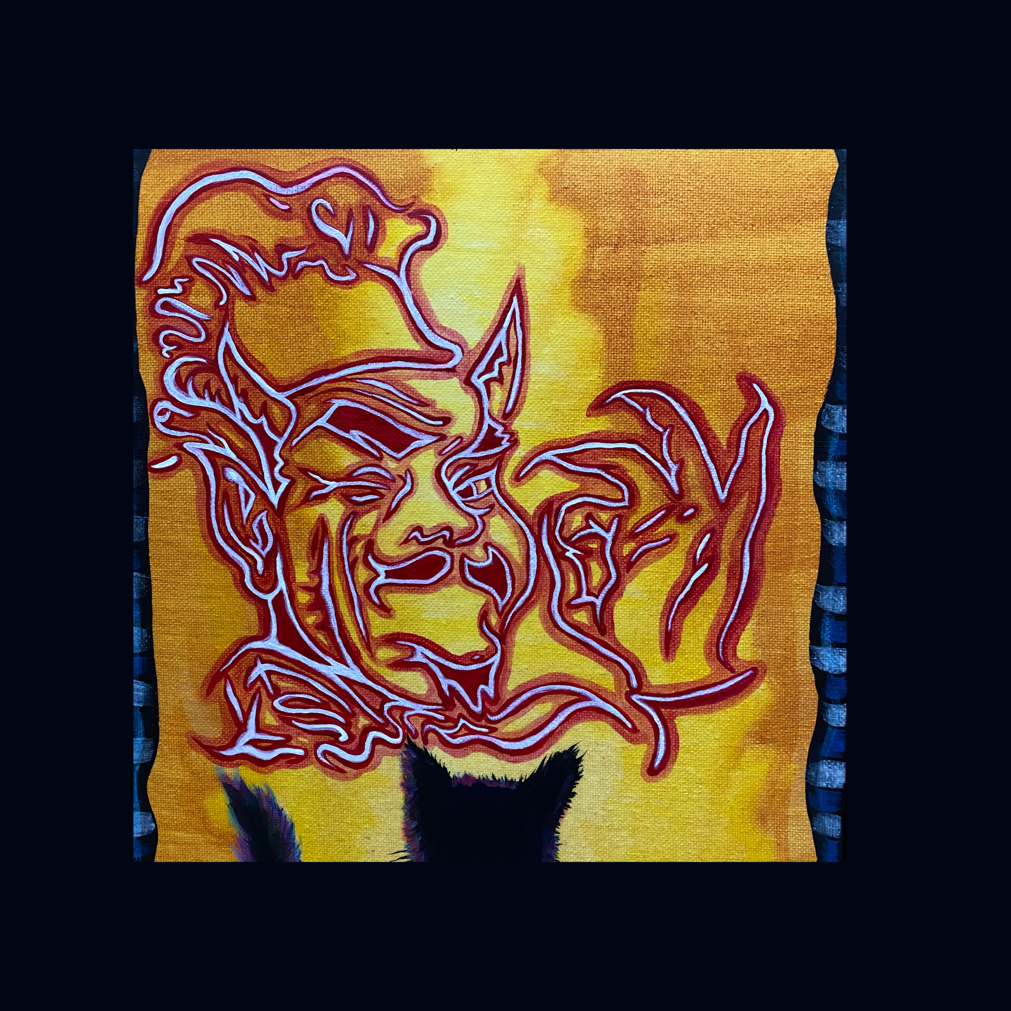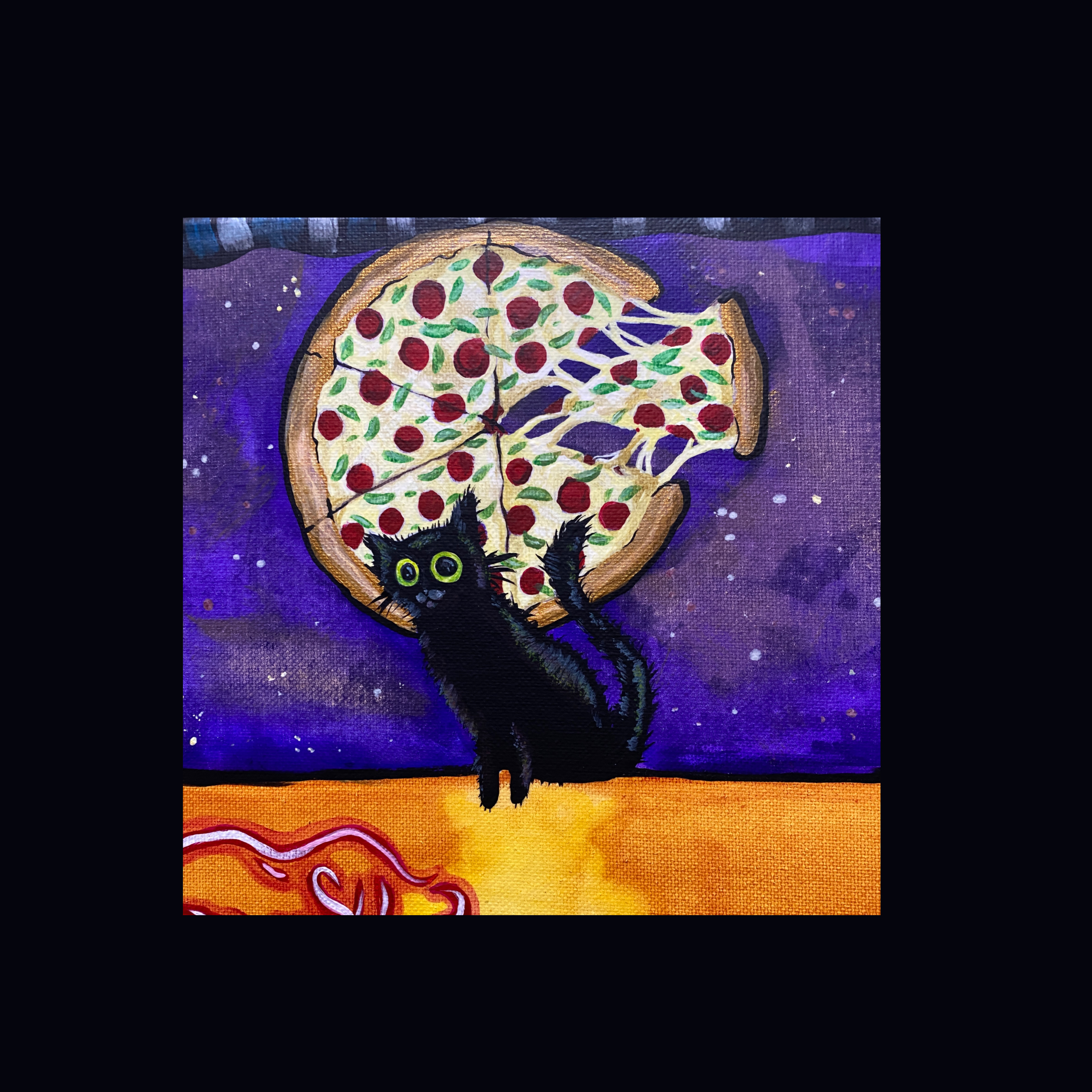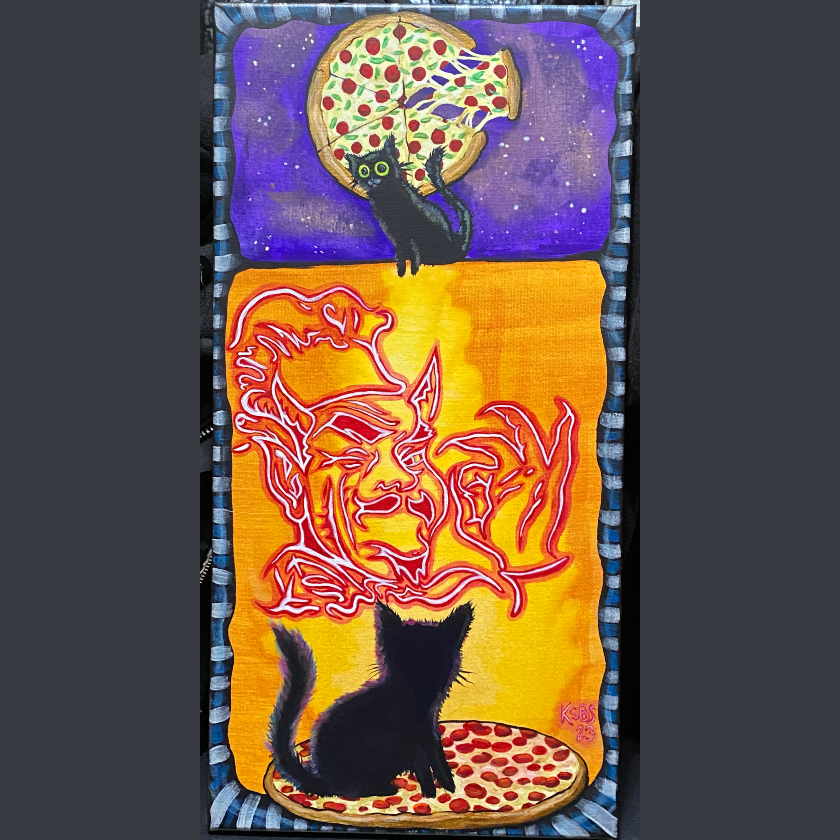10x20 acrylic on canvas of two black cats with pizza and a demonic Pizza Box Guy glowing between them.