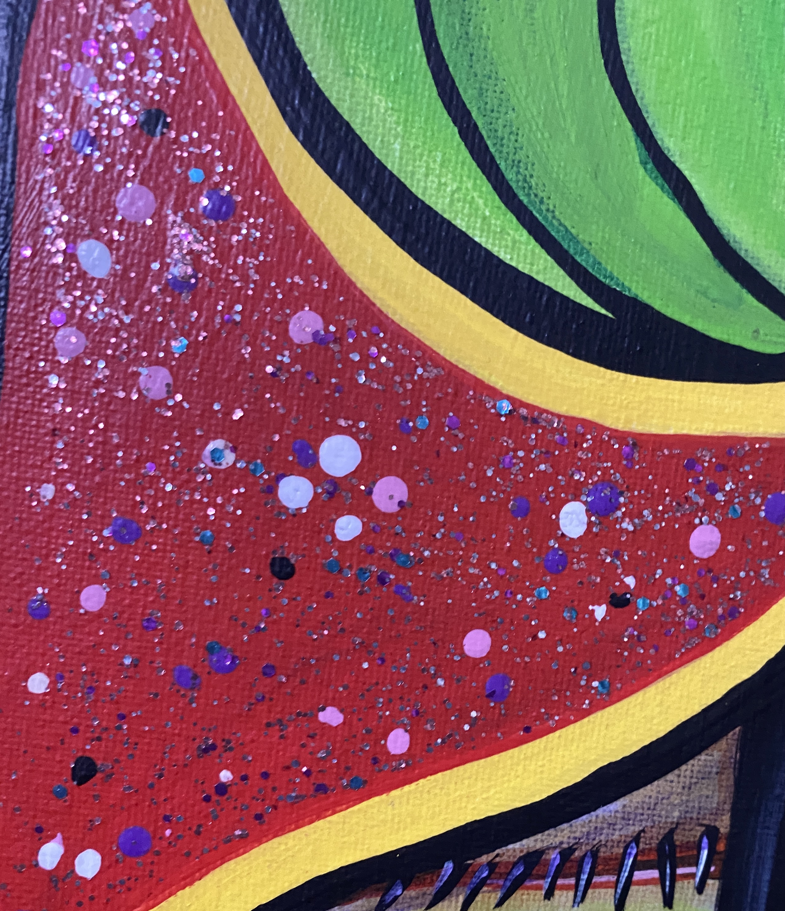 18x24 acrylic on canvas. It’s hard to see, but the background is glitter. Do not fear, it’s glitter paint, not loose, and it won’t shed all over. I hate loose glitter.