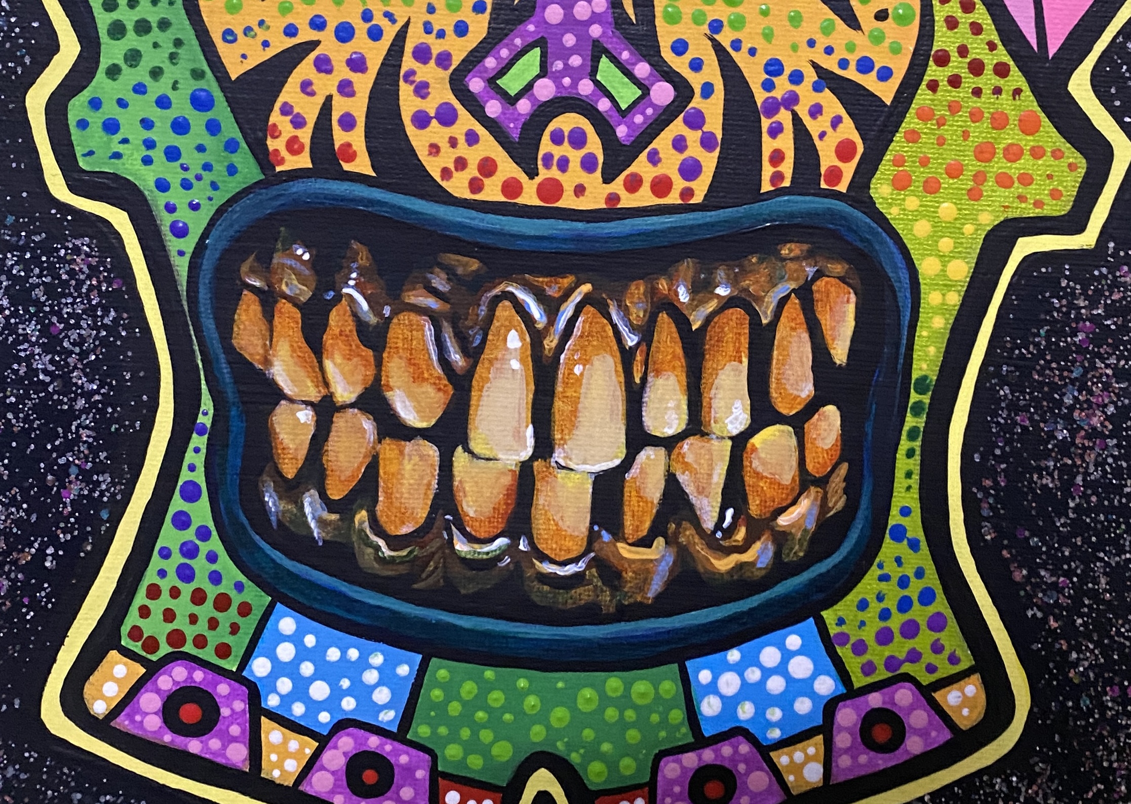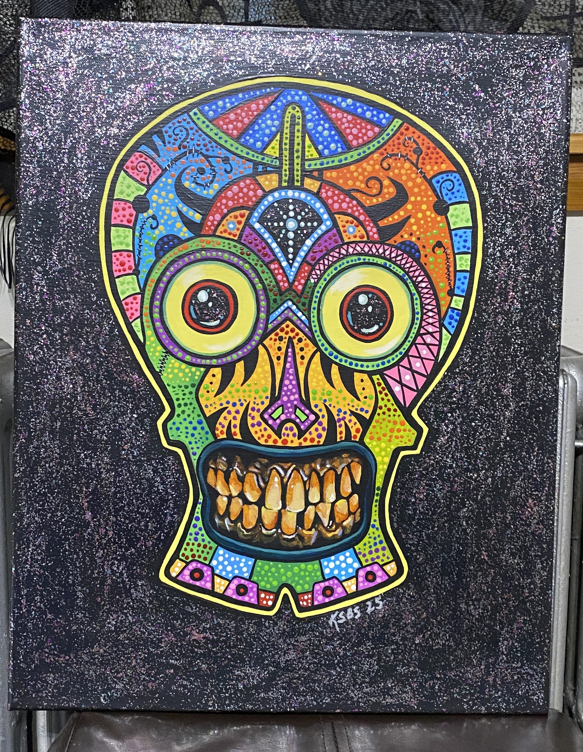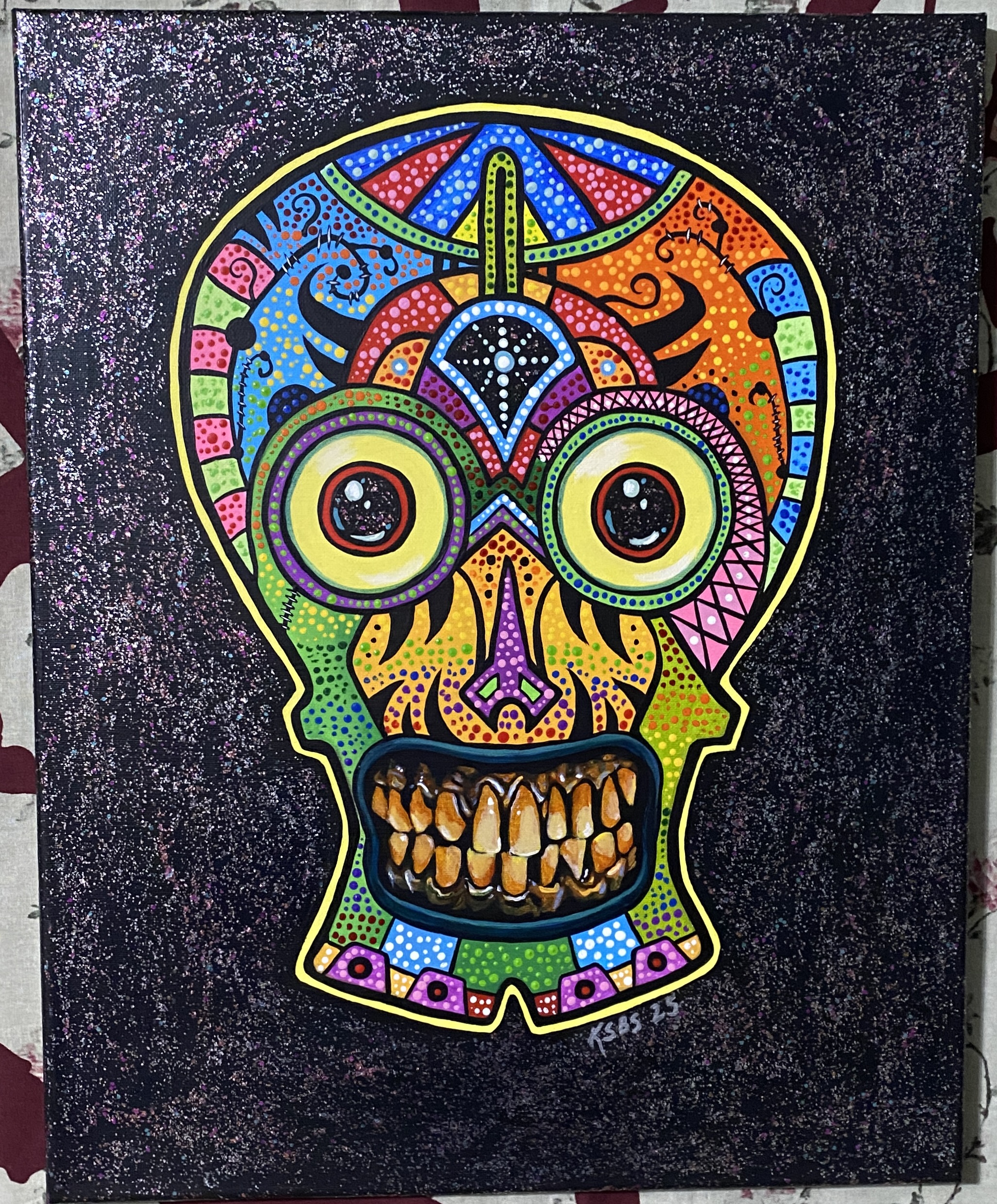16x20 acrylic on canvas. It’s hard to accurately capture the glittery background so I took a few pictures. And look at the TEETH! This will scare visitors FOREVER