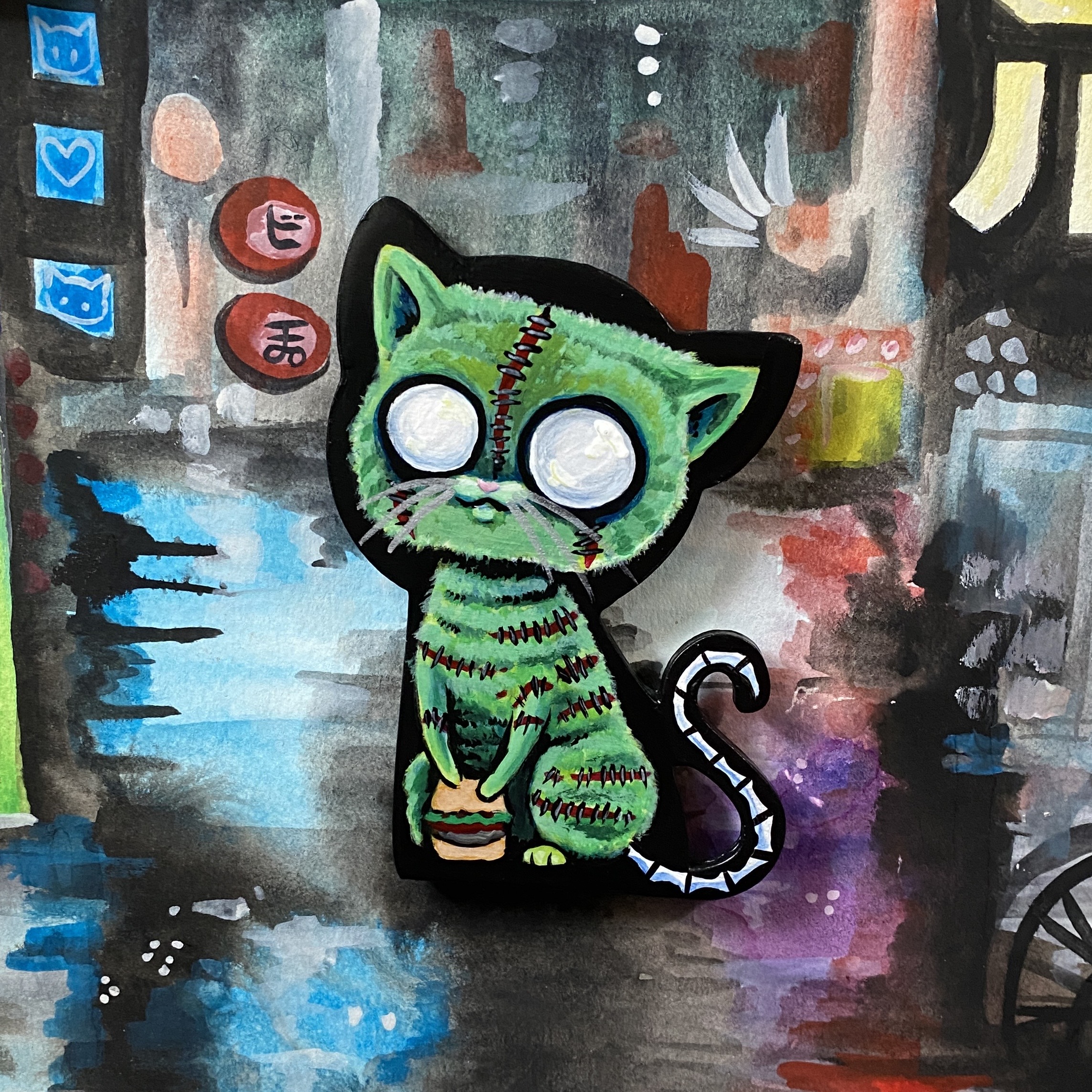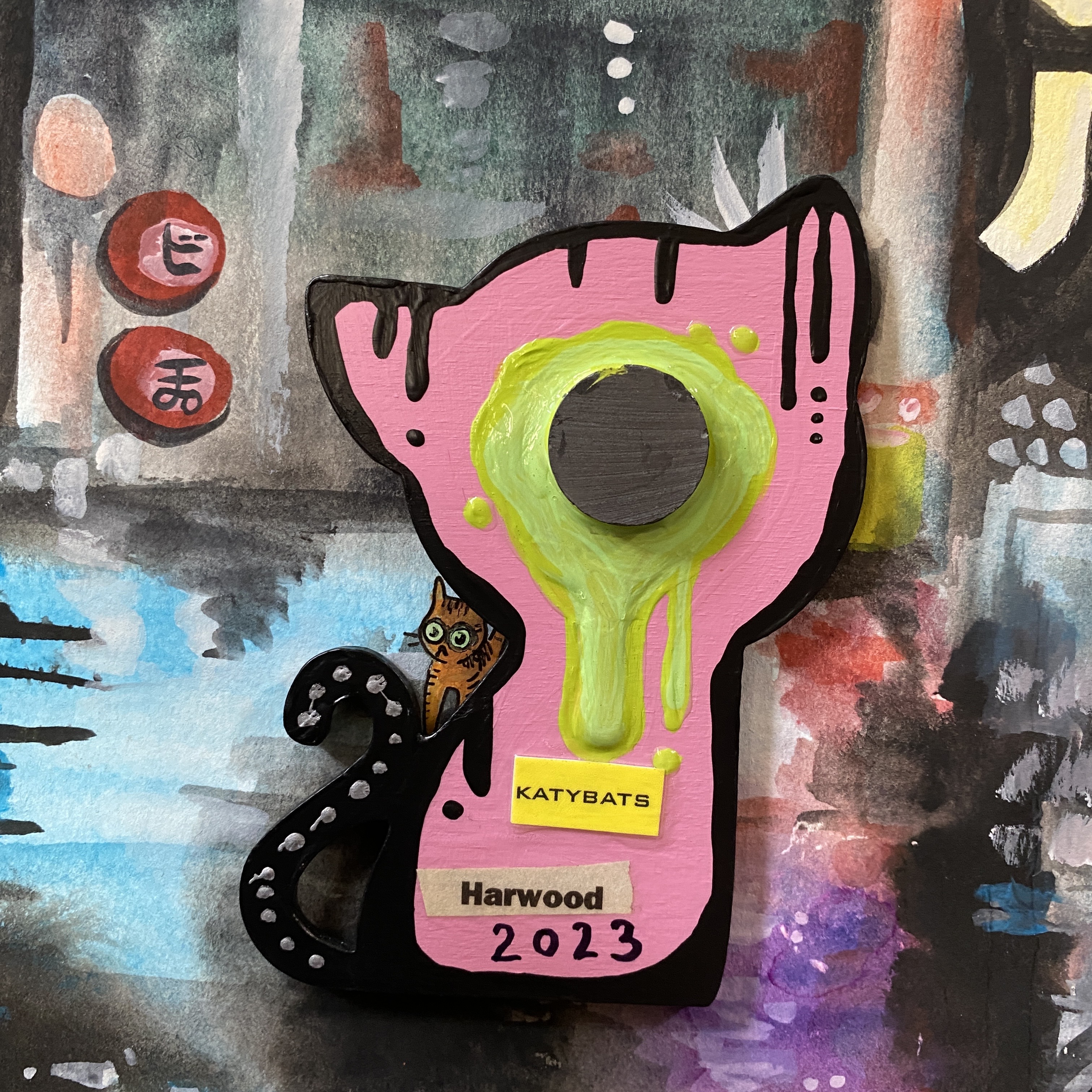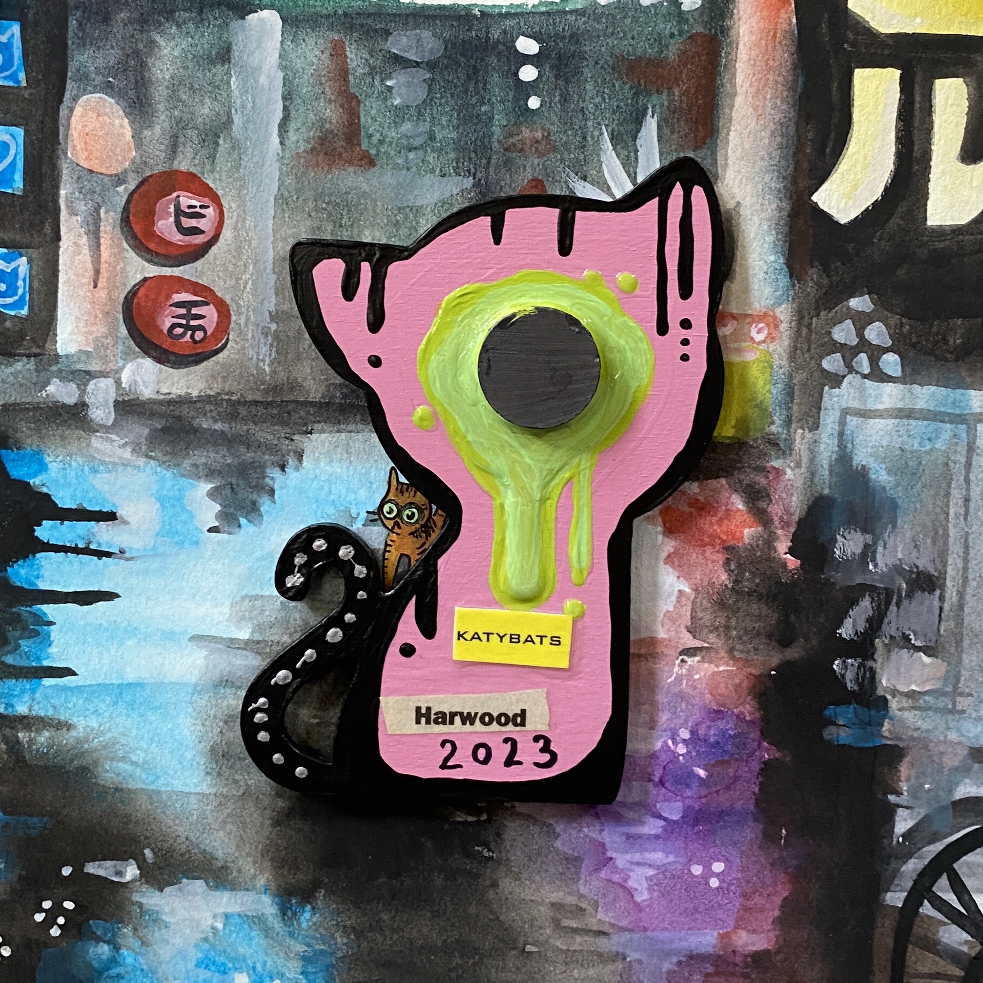 about 3 by 4 inches. wooden magnet kitty. Painted with acrylic, matte finish. Gloss on the shiny parts. It’s a very strong magnet.