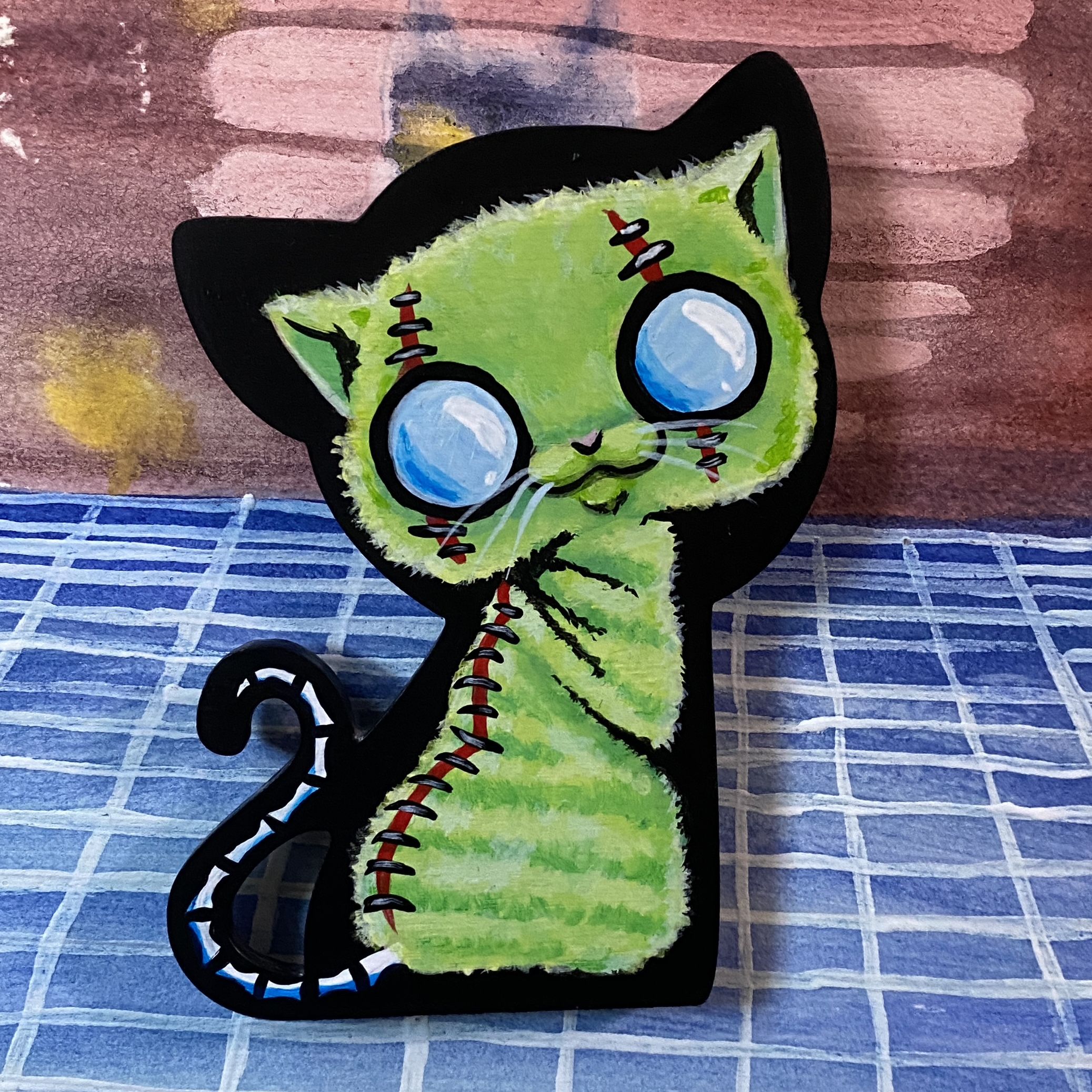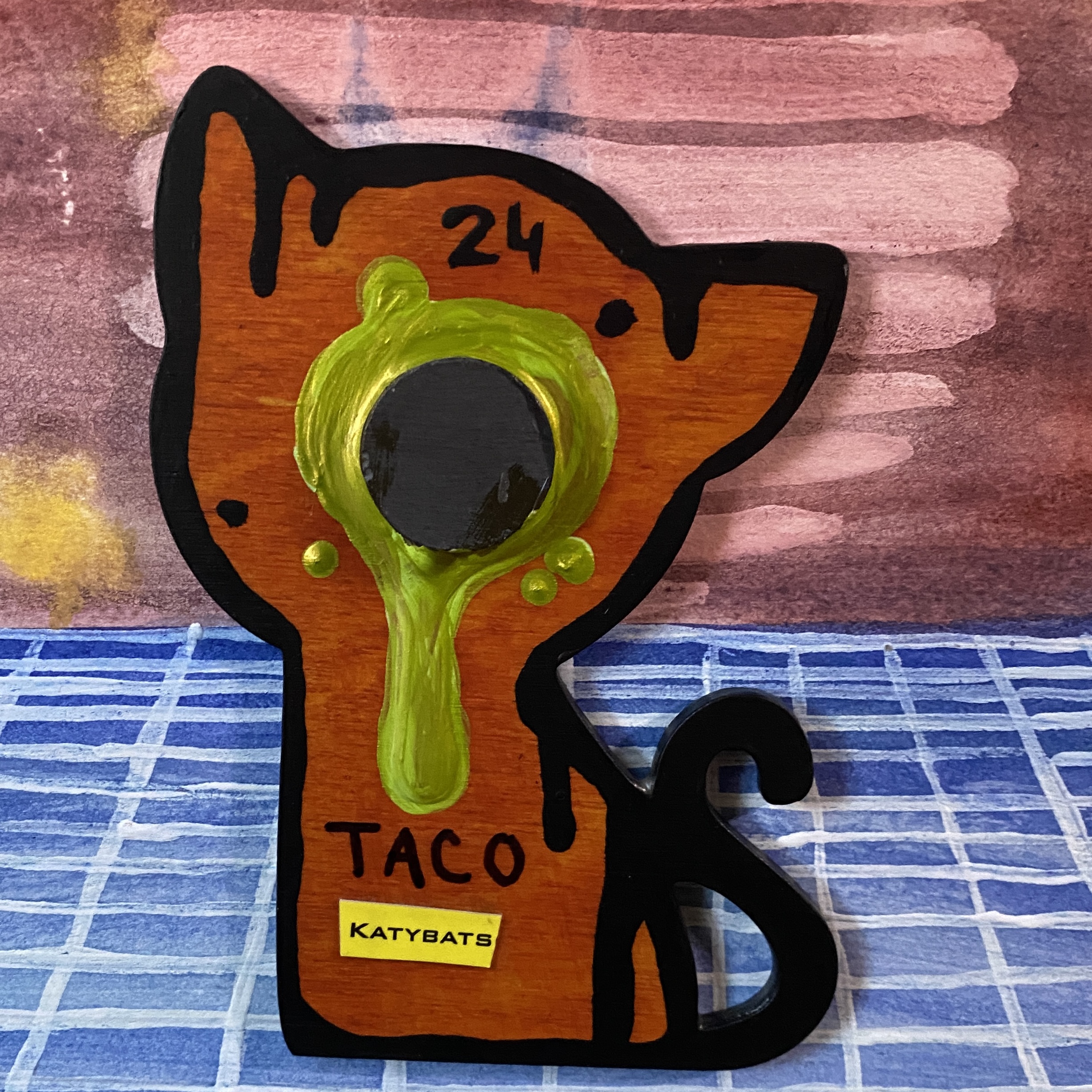 about 3 by 4 inches. wooden magnet kitty. Acrylic paint. Named Taco even though there’s no taco to be seen. Just a lil Zombicat.