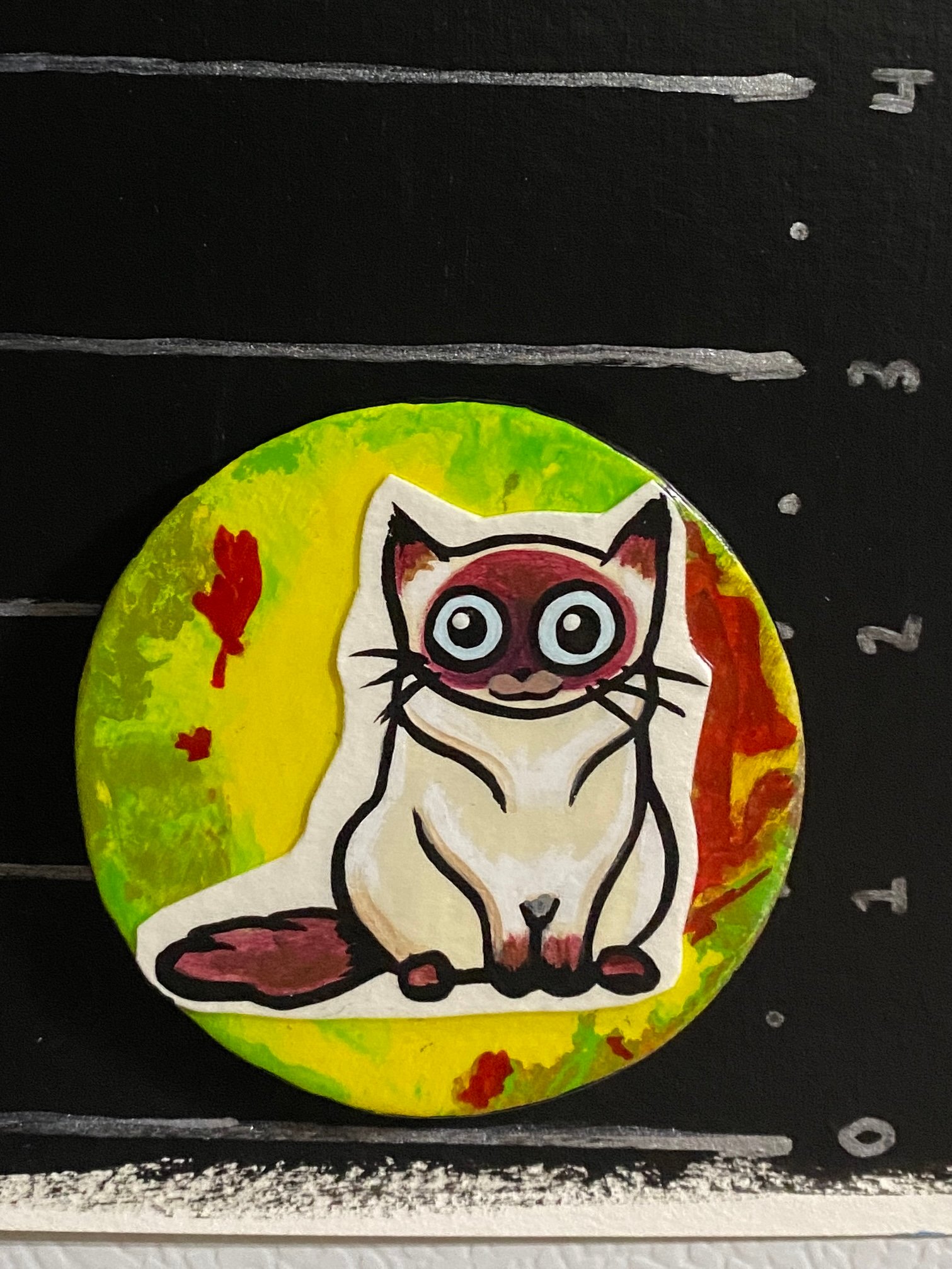 Almost three inches across, a hand painted wooden circle magnet. The kitty was painted with acrylic onto watercolor paper and then affixed to the wood and sealed. The colors invoke the autumn season. The kitties invoke cuteness.
