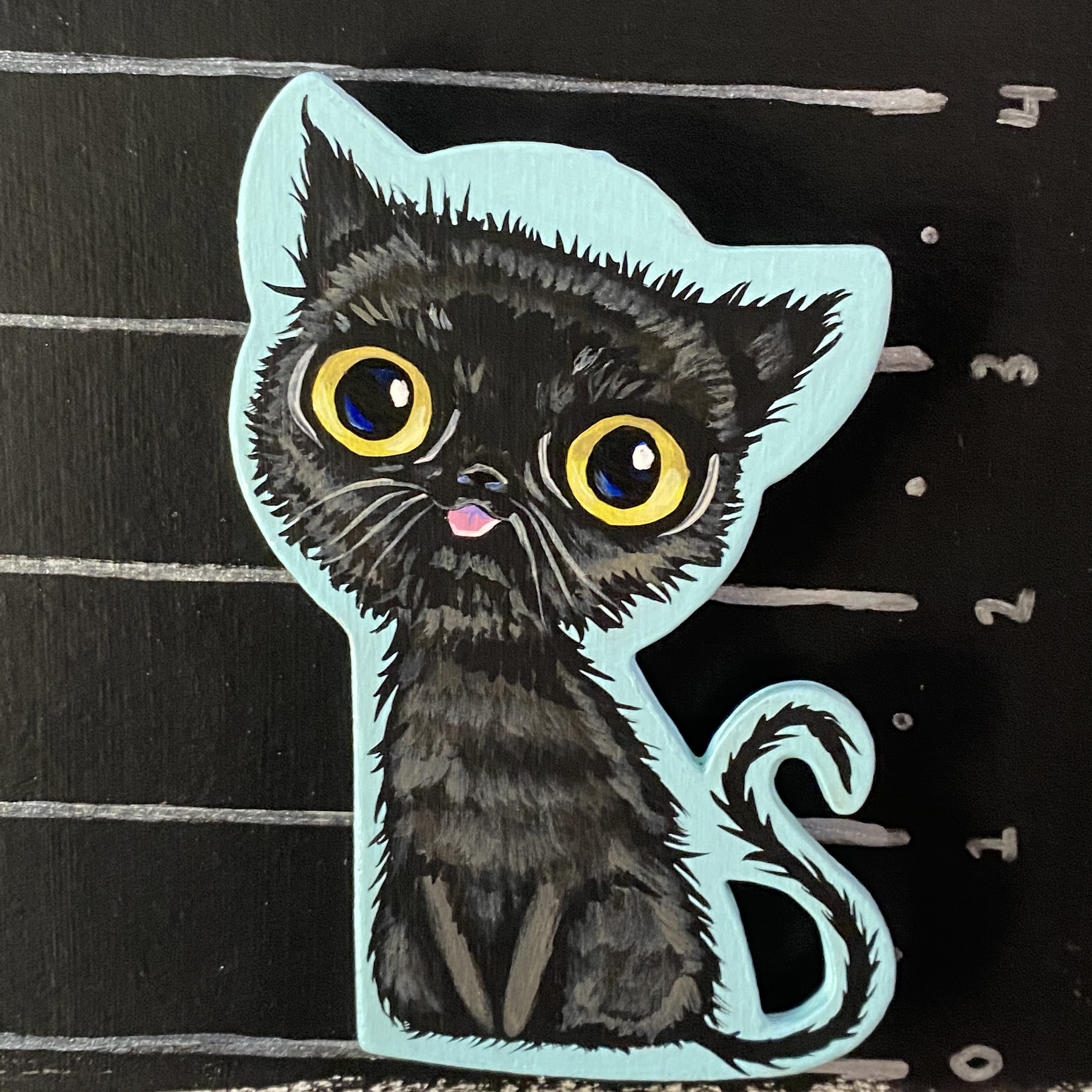 about 3 by 4 inches. Hand painted wooden magnet kitty. Acrylic paint.