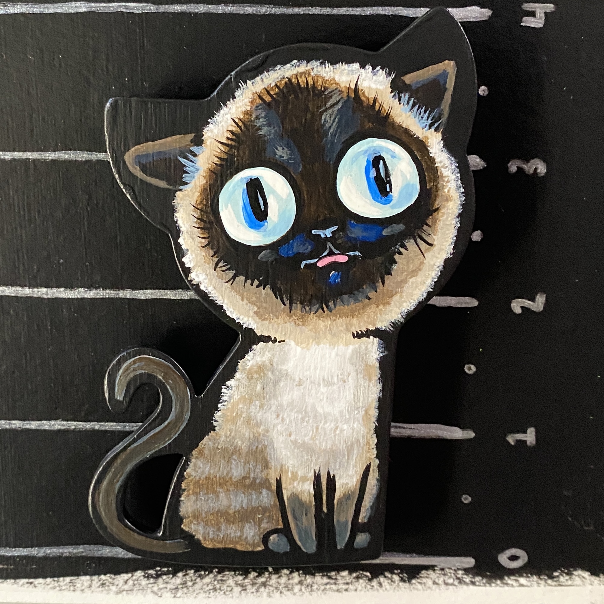 about 3 by 4 inches. Hand painted wooden magnet kitty. Acrylic paint.