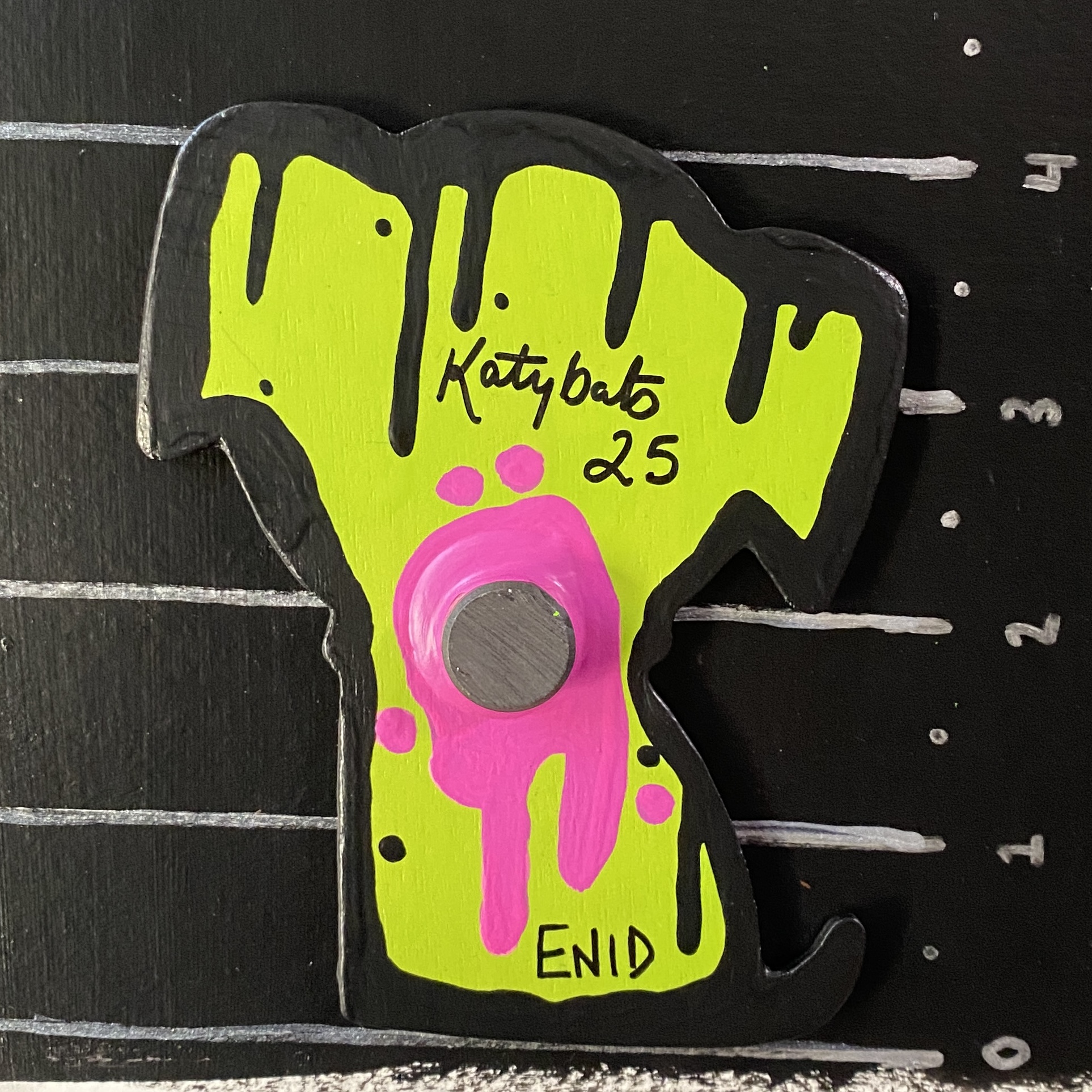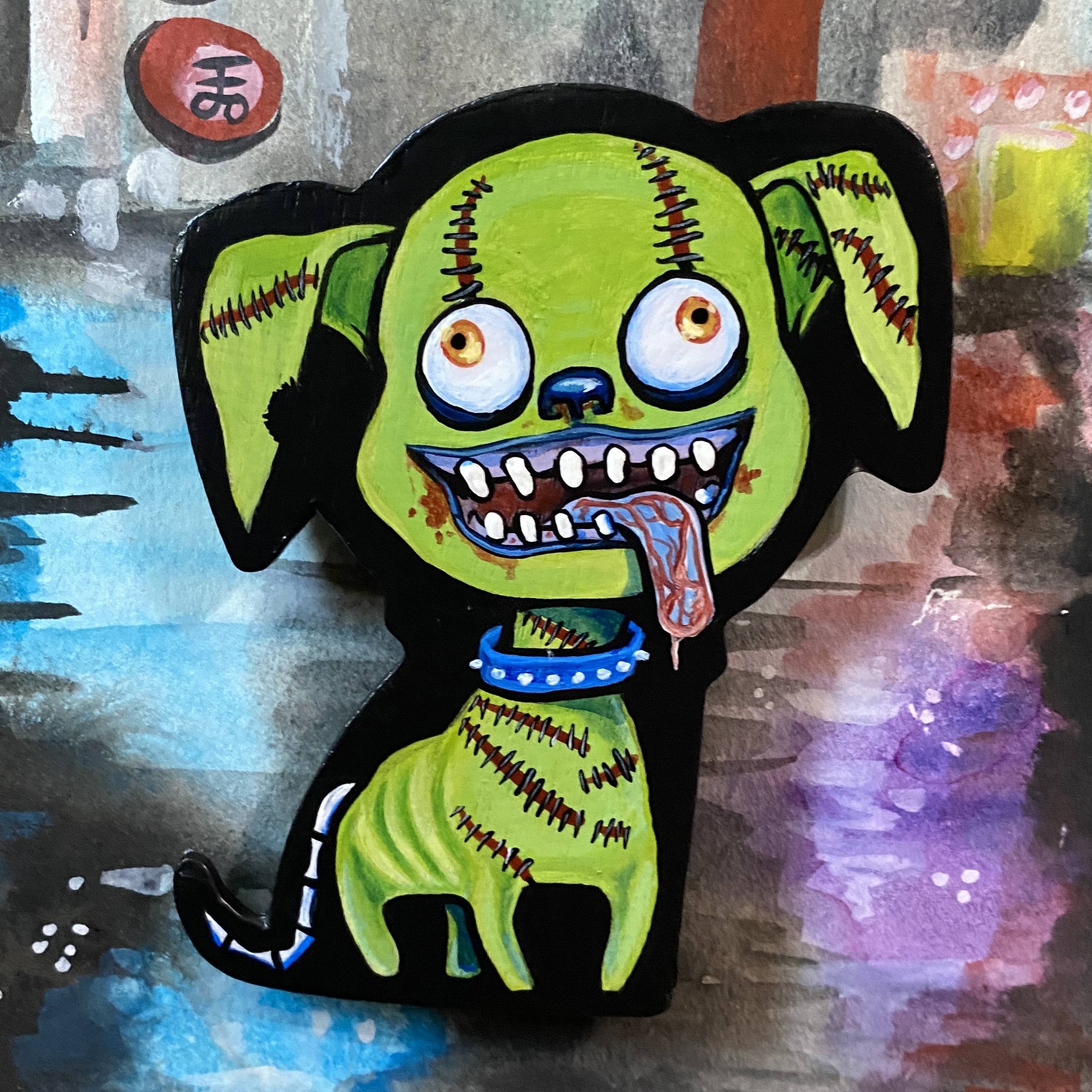 about 3 by 4 inches. wooden magnet puppy. Acrylic paint.