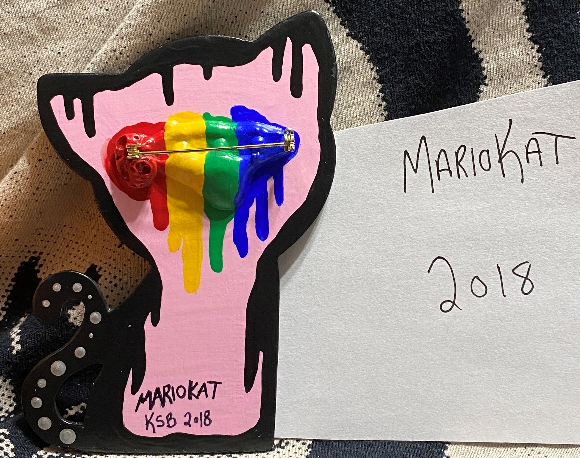 about 3 by 4 inches. wooden pinback kitty.