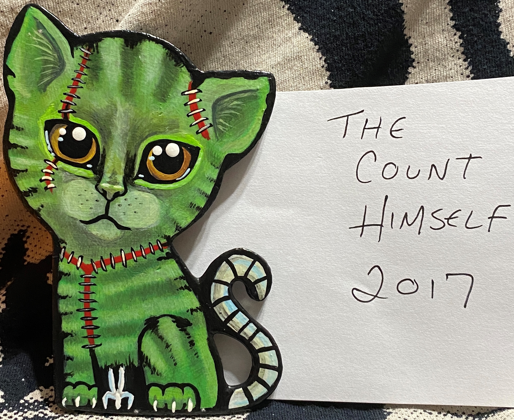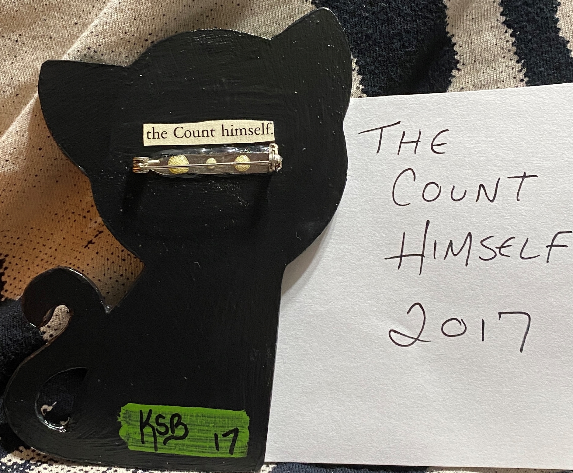 about 3 by 4 inches. wooden pinback kitty.