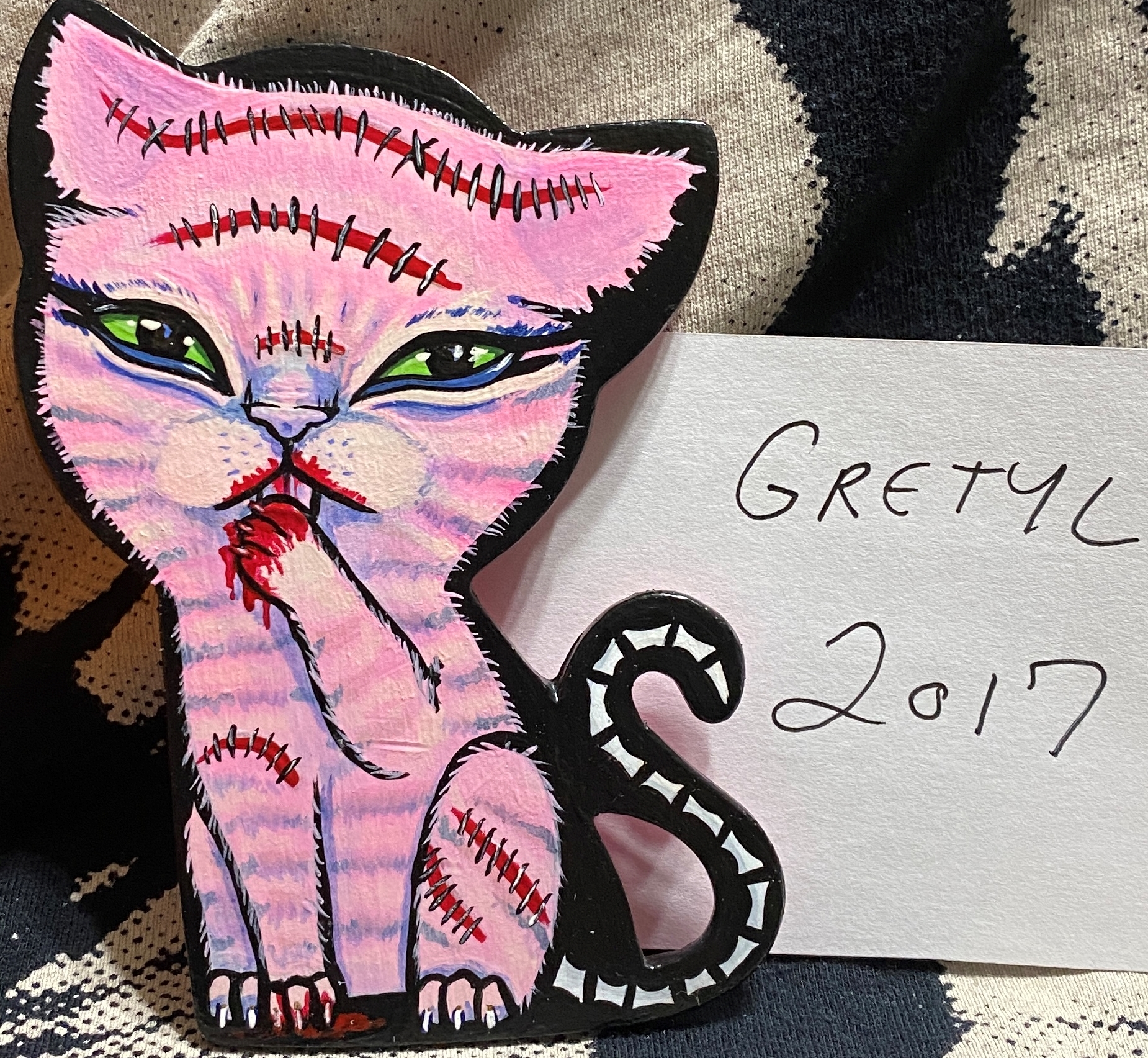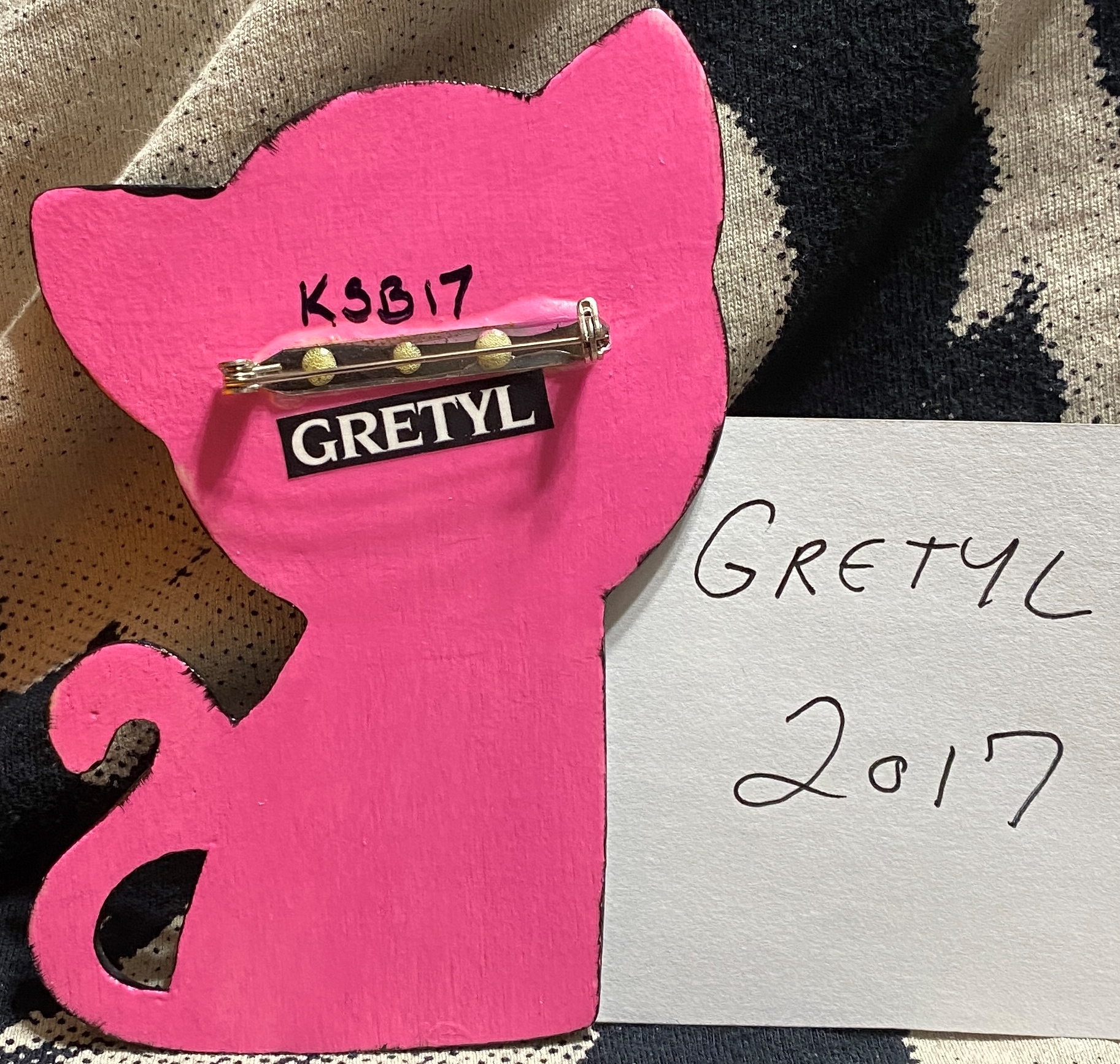 about 3 by 4 inches. wooden pinback kitty.