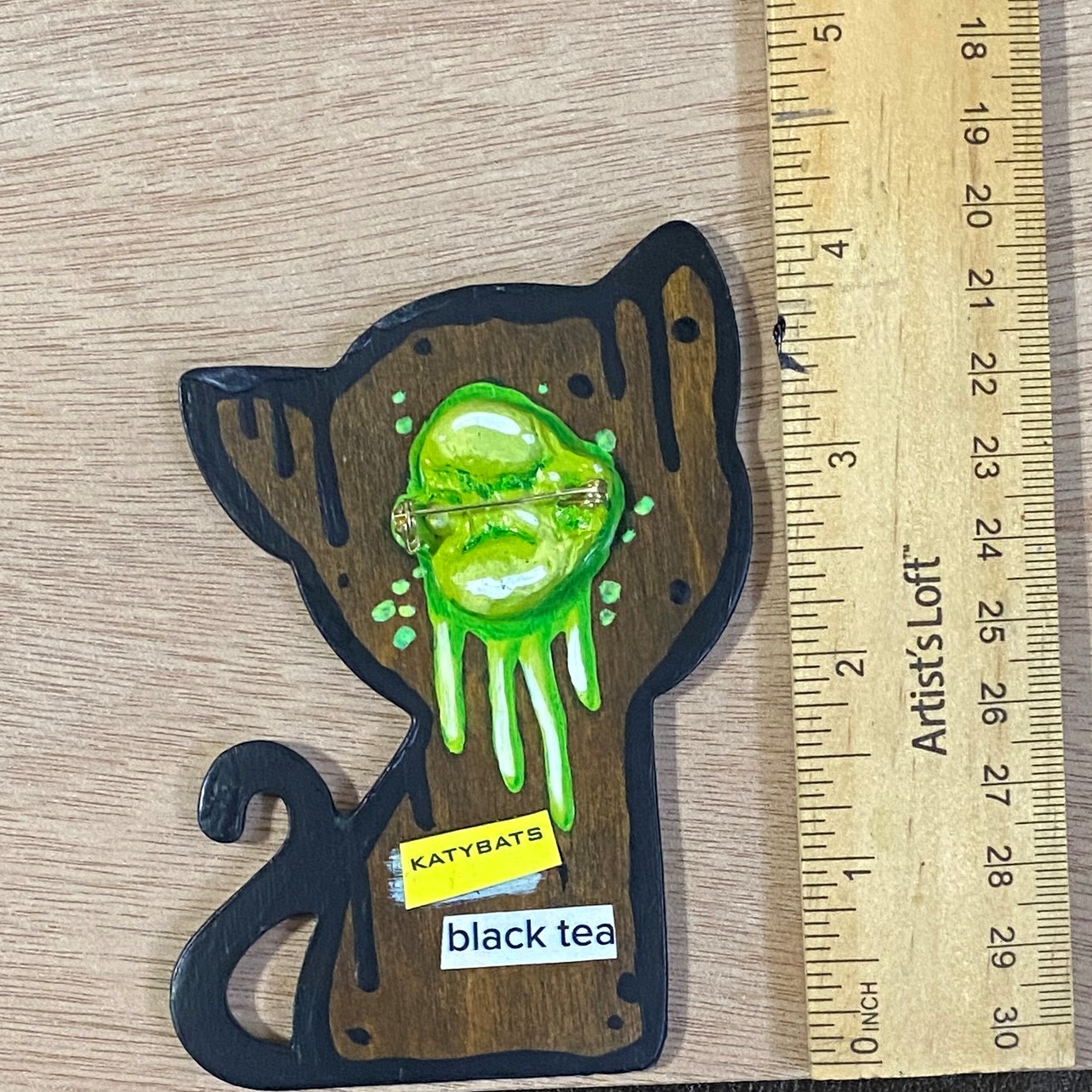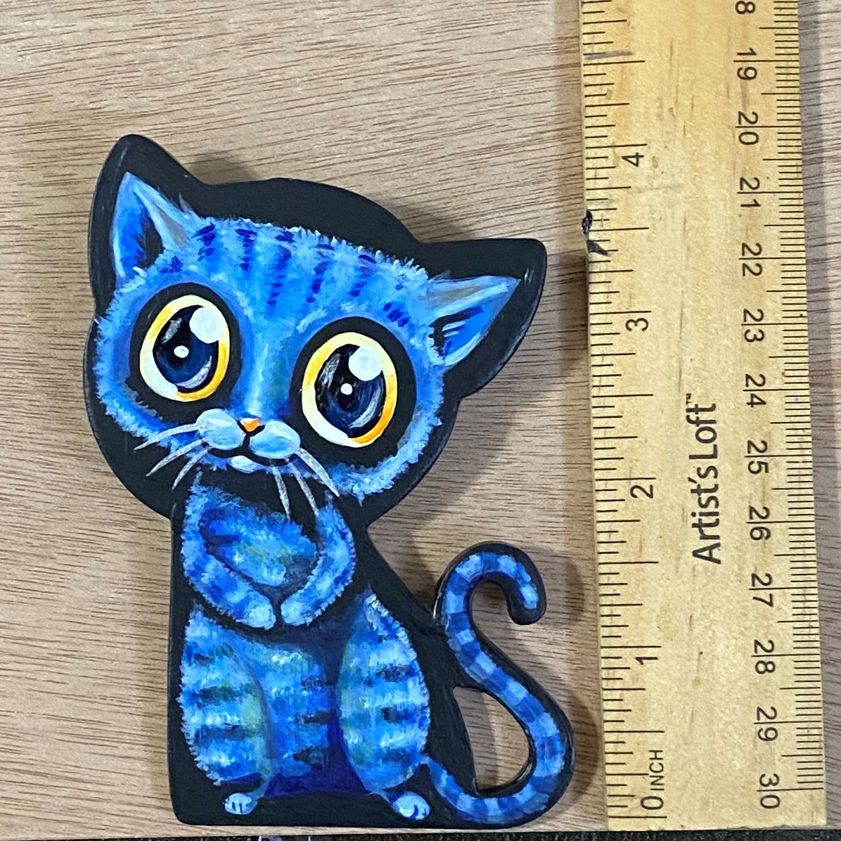 about 3 by 4 inches. wooden pinback kitty. started in 2019 and forgotten until now