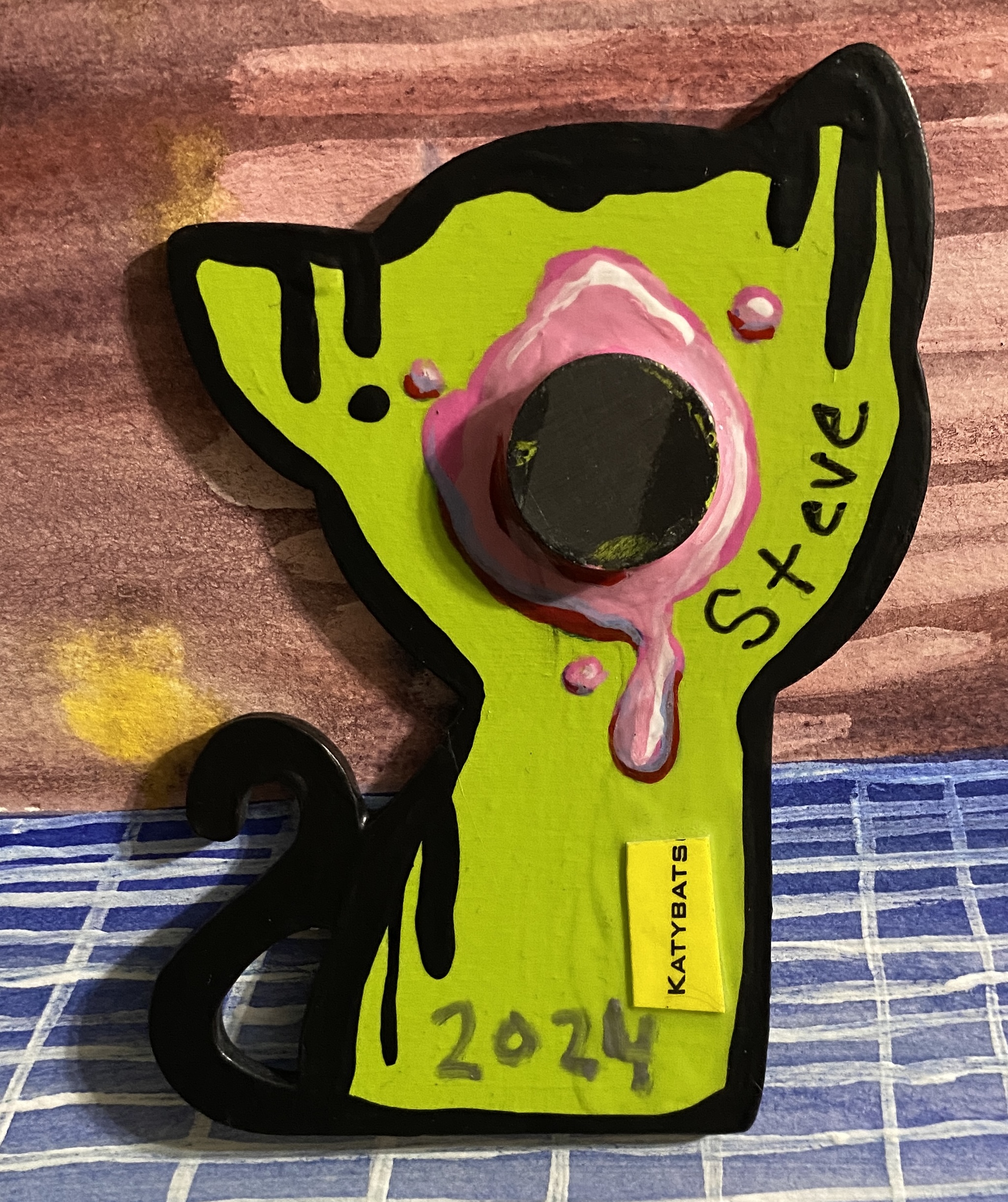 about 3 by 4 inches. wooden magnet kitty. Acrylic paint. The original Steve design, no gimmicks