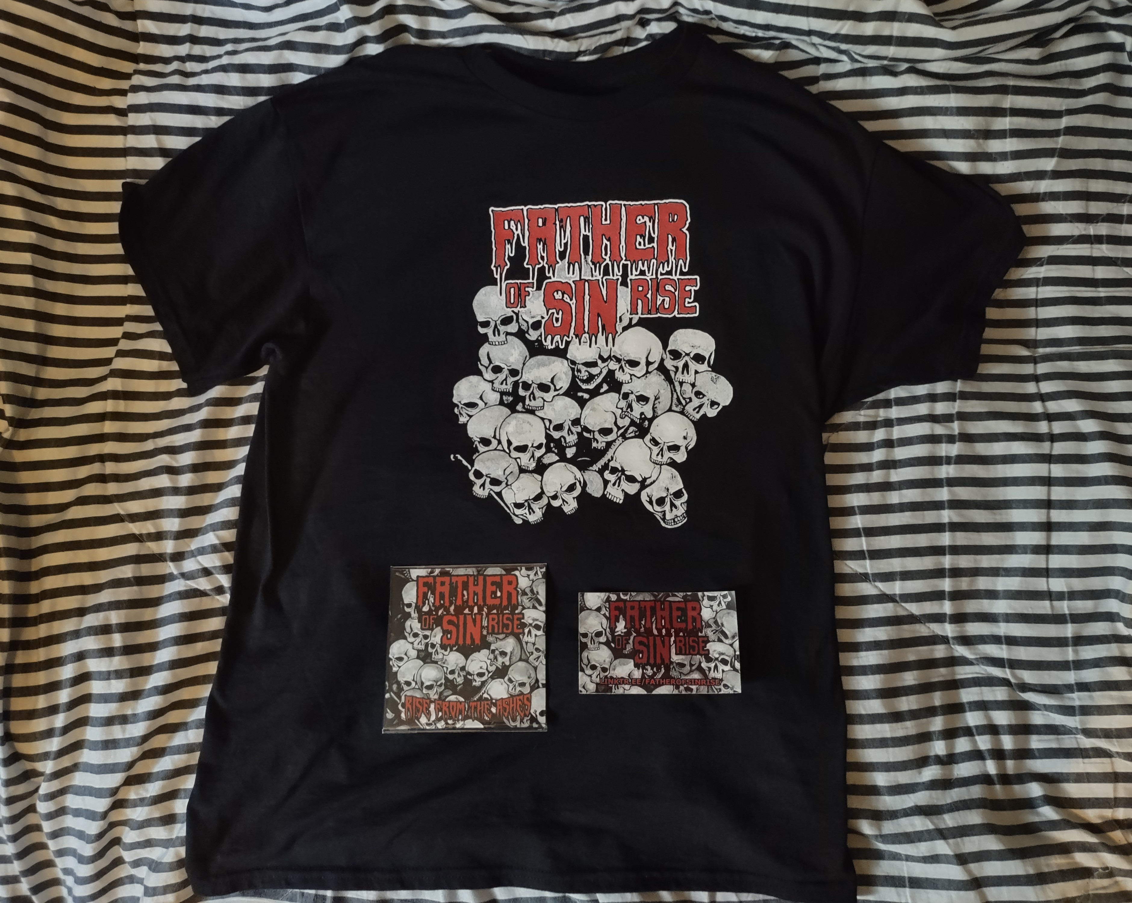 T-Shirt, CD, and sticker bundle from Father Of Sin Rise. Album artwork by Katybats. Limited quantities available.