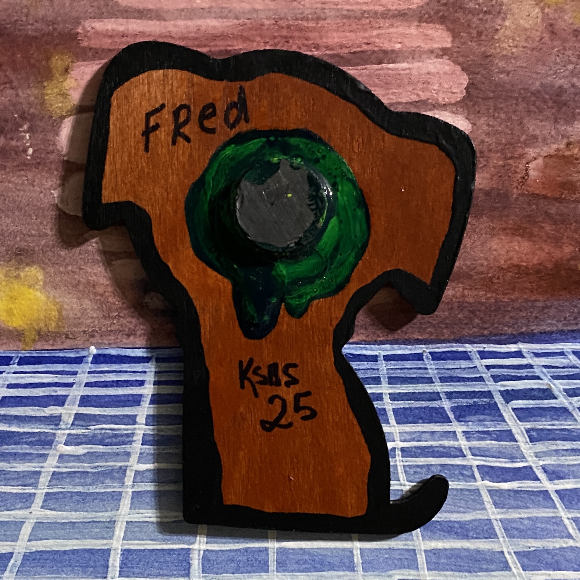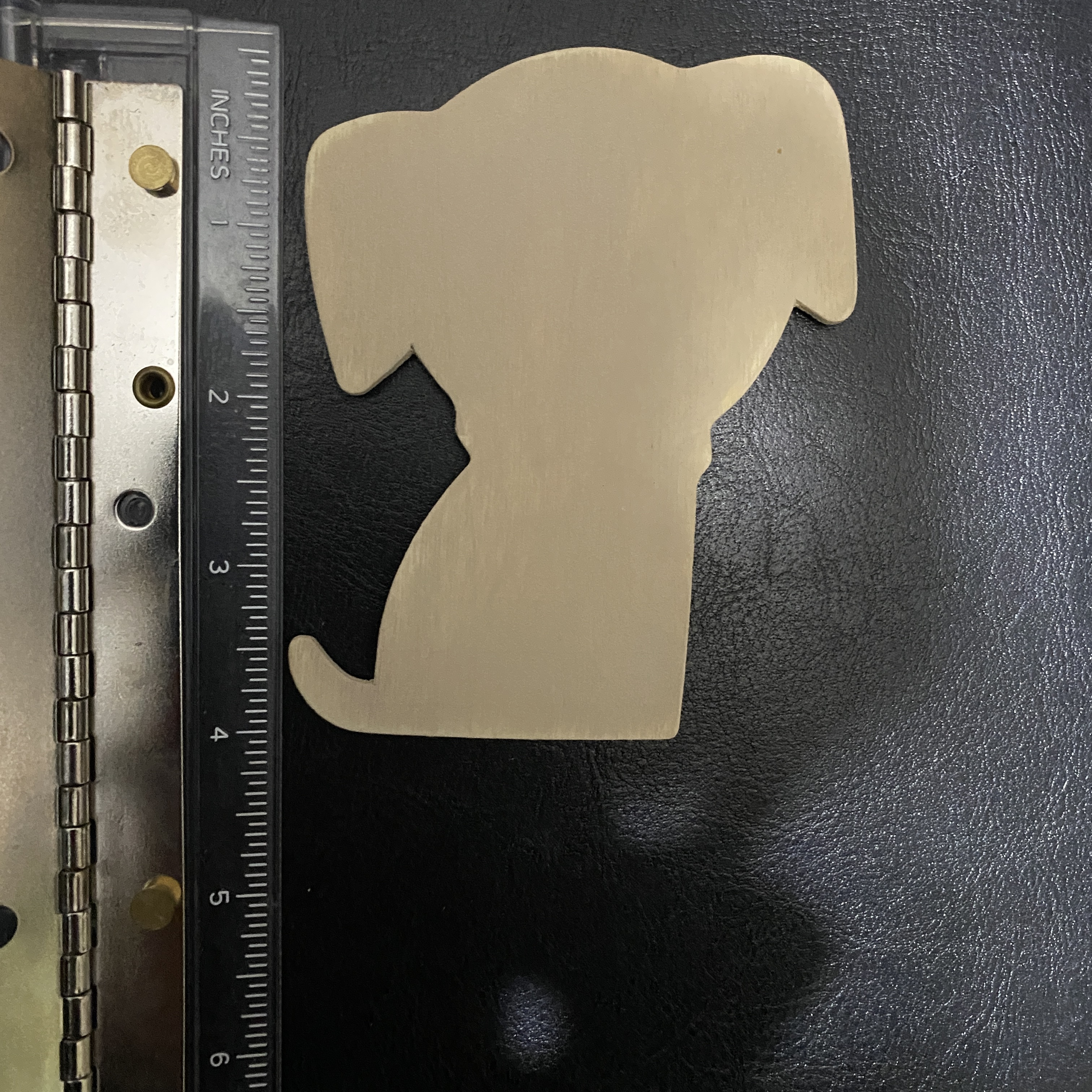 about 3 by 4 inches. wooden magnet dog. Acrylic paint. This particular one is a little warped. Like it’s not as flat as it ought to be.