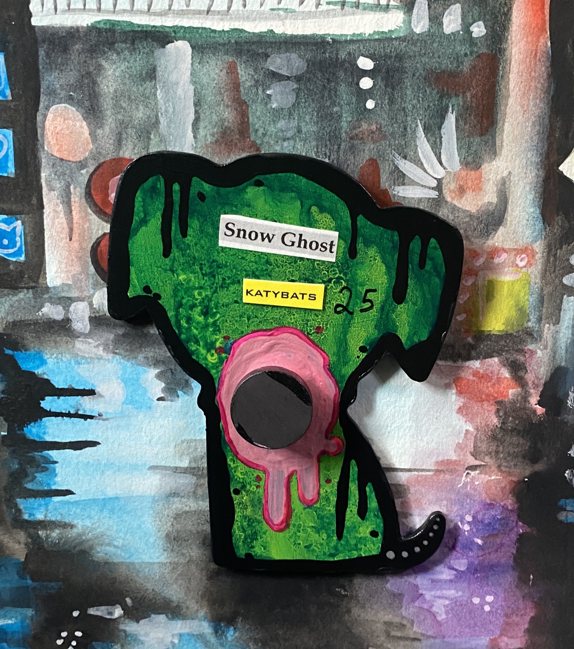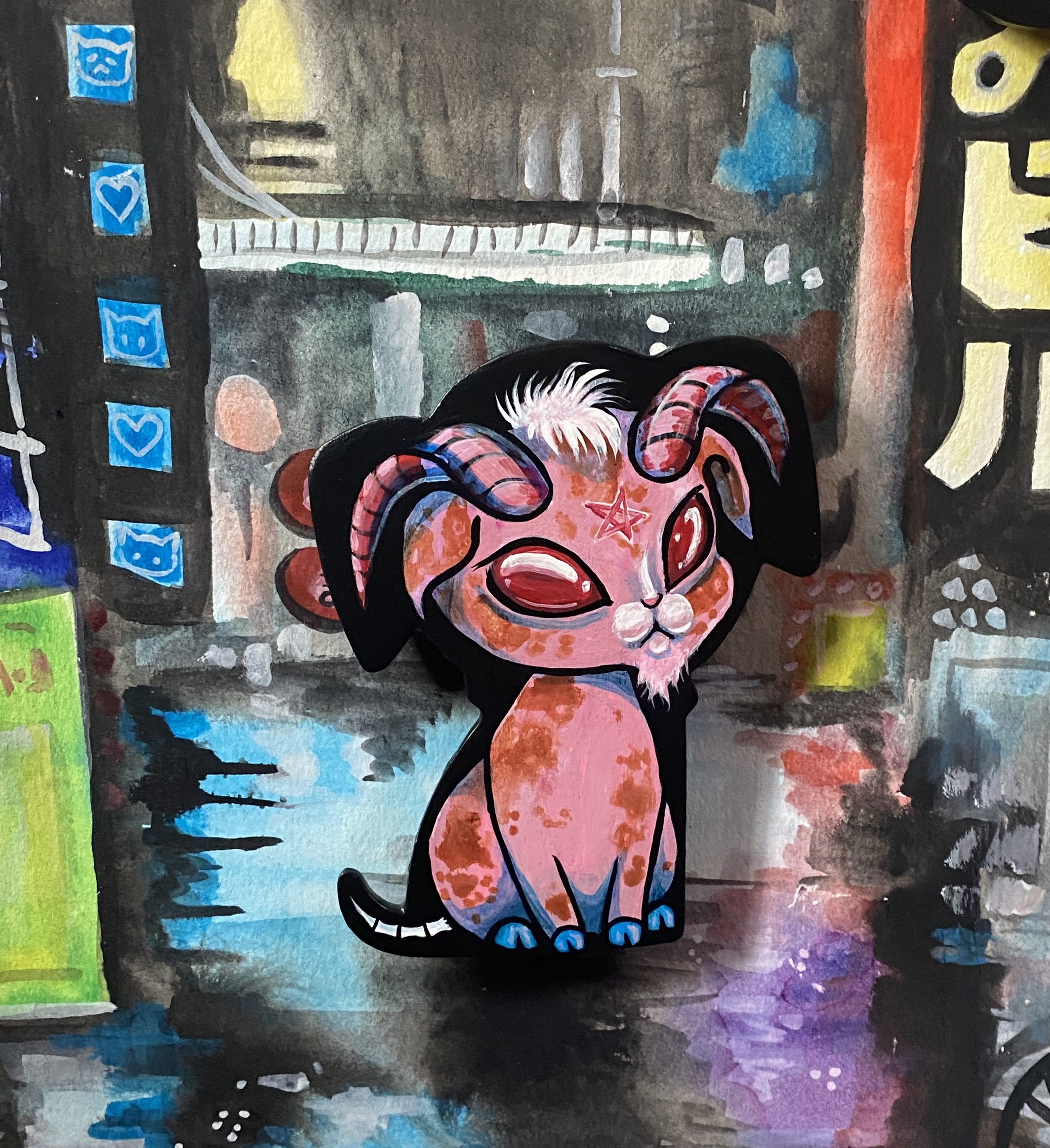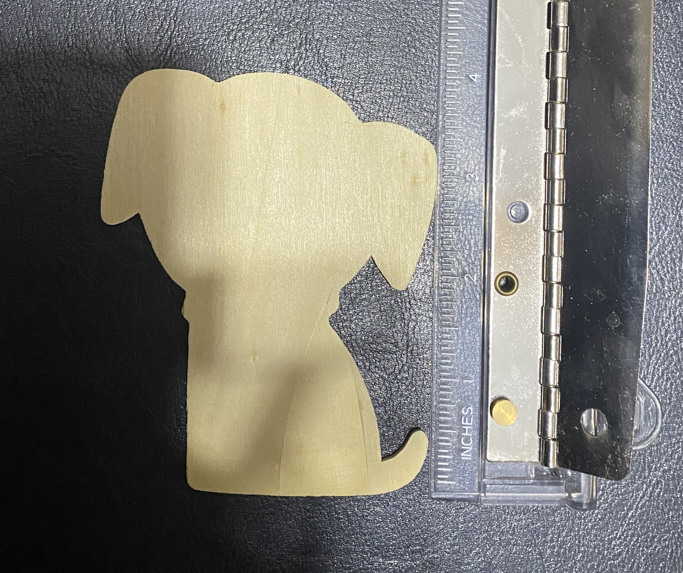 about 3 by 4 inches. wooden magnet puppy. Acrylic paint.