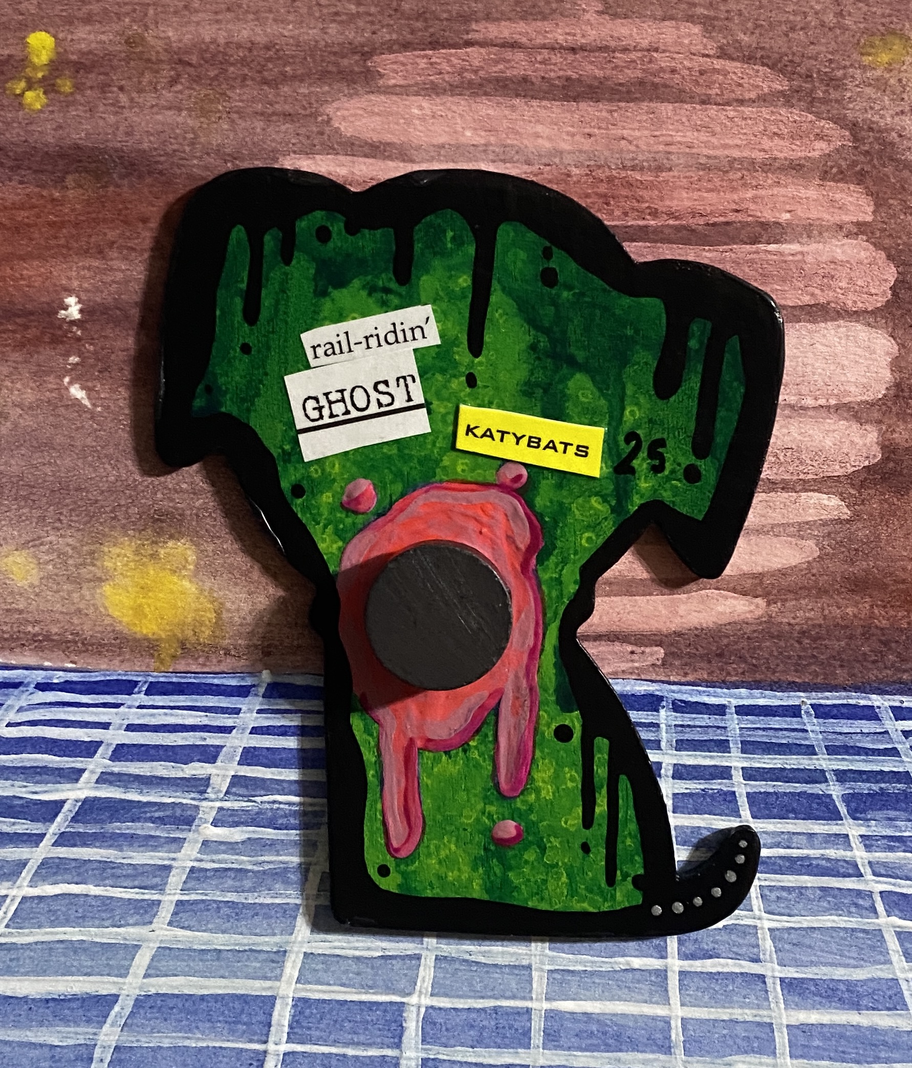 about 3 by 4 inches. wooden magnet puppy. Acrylic paint.