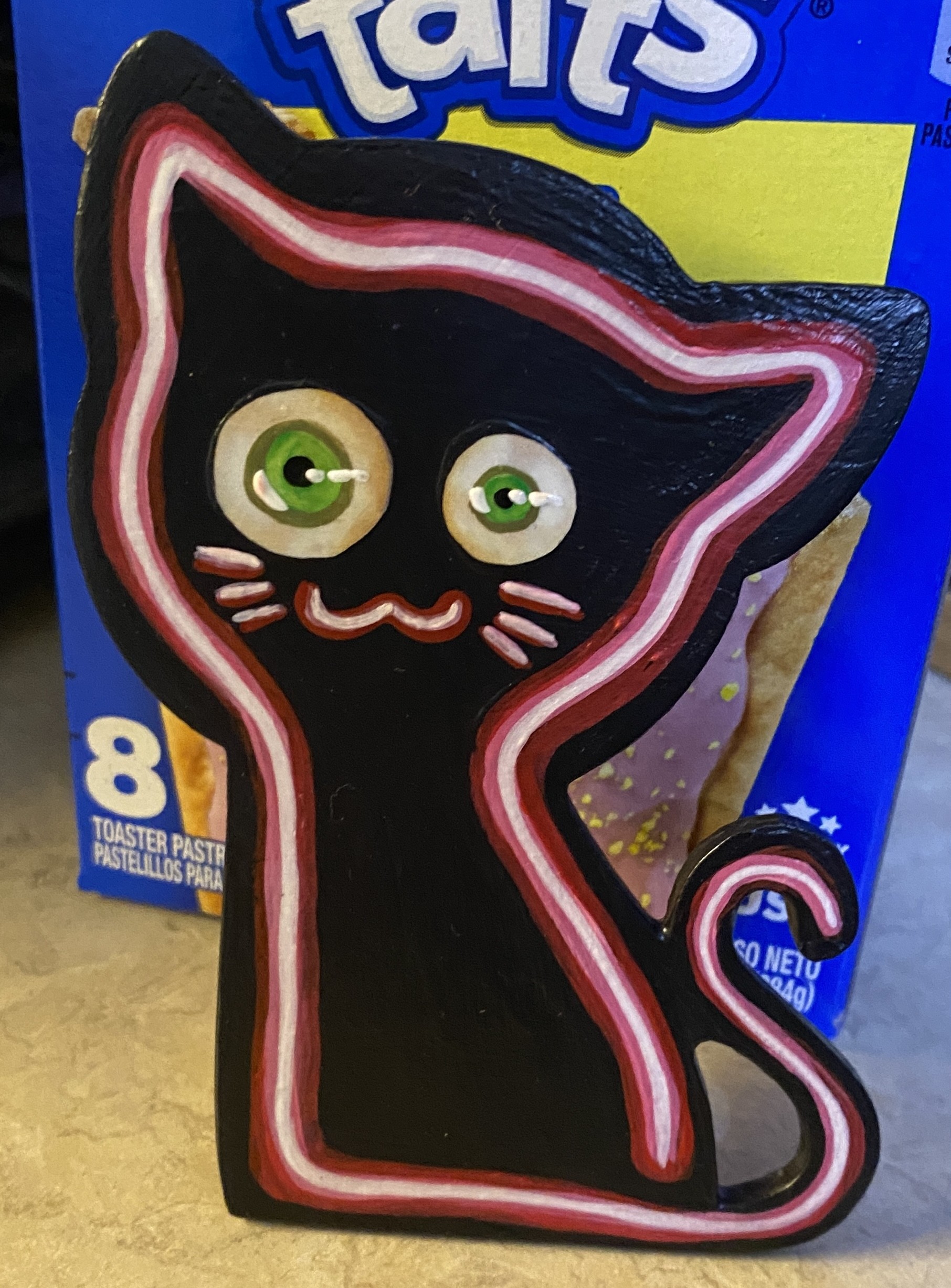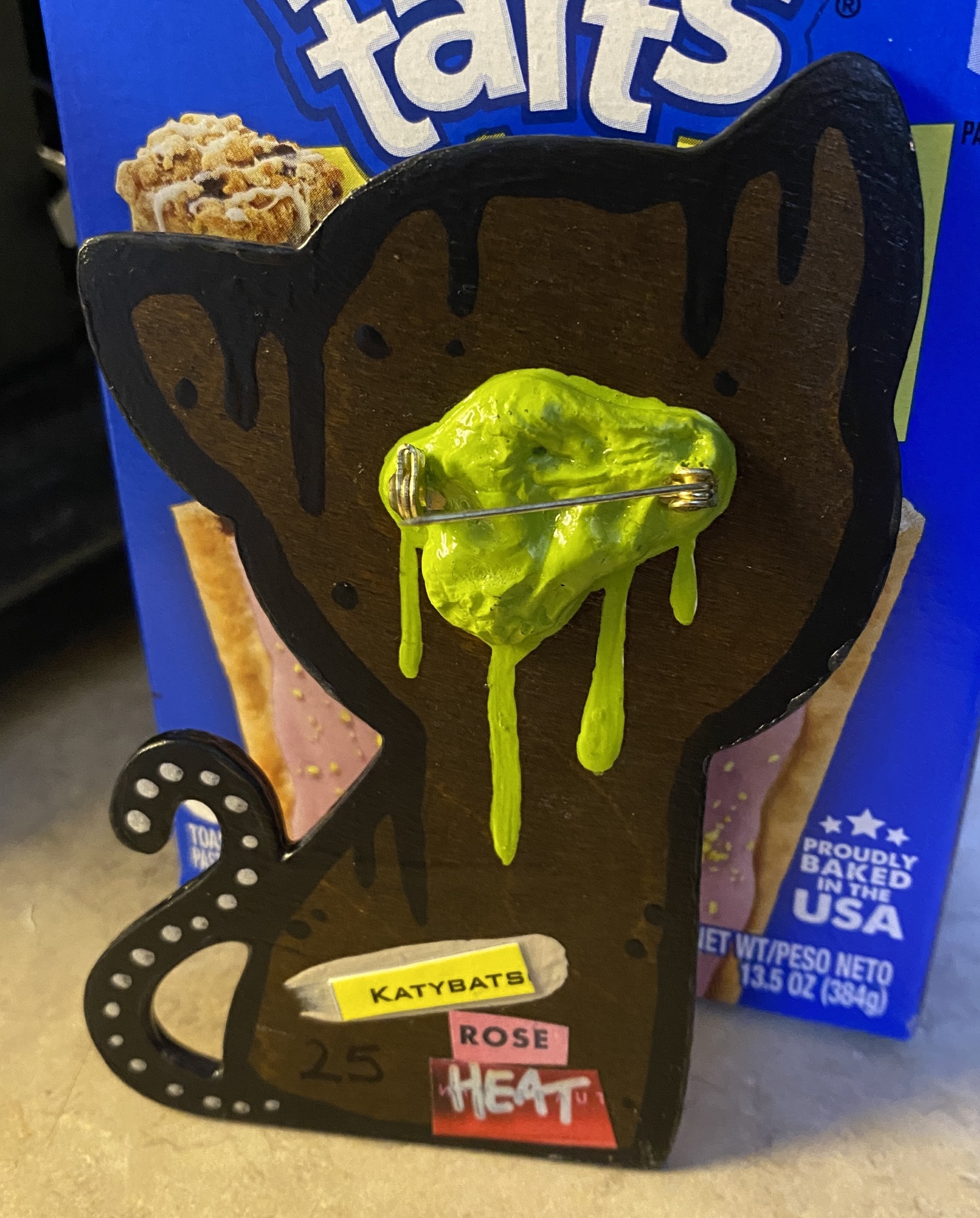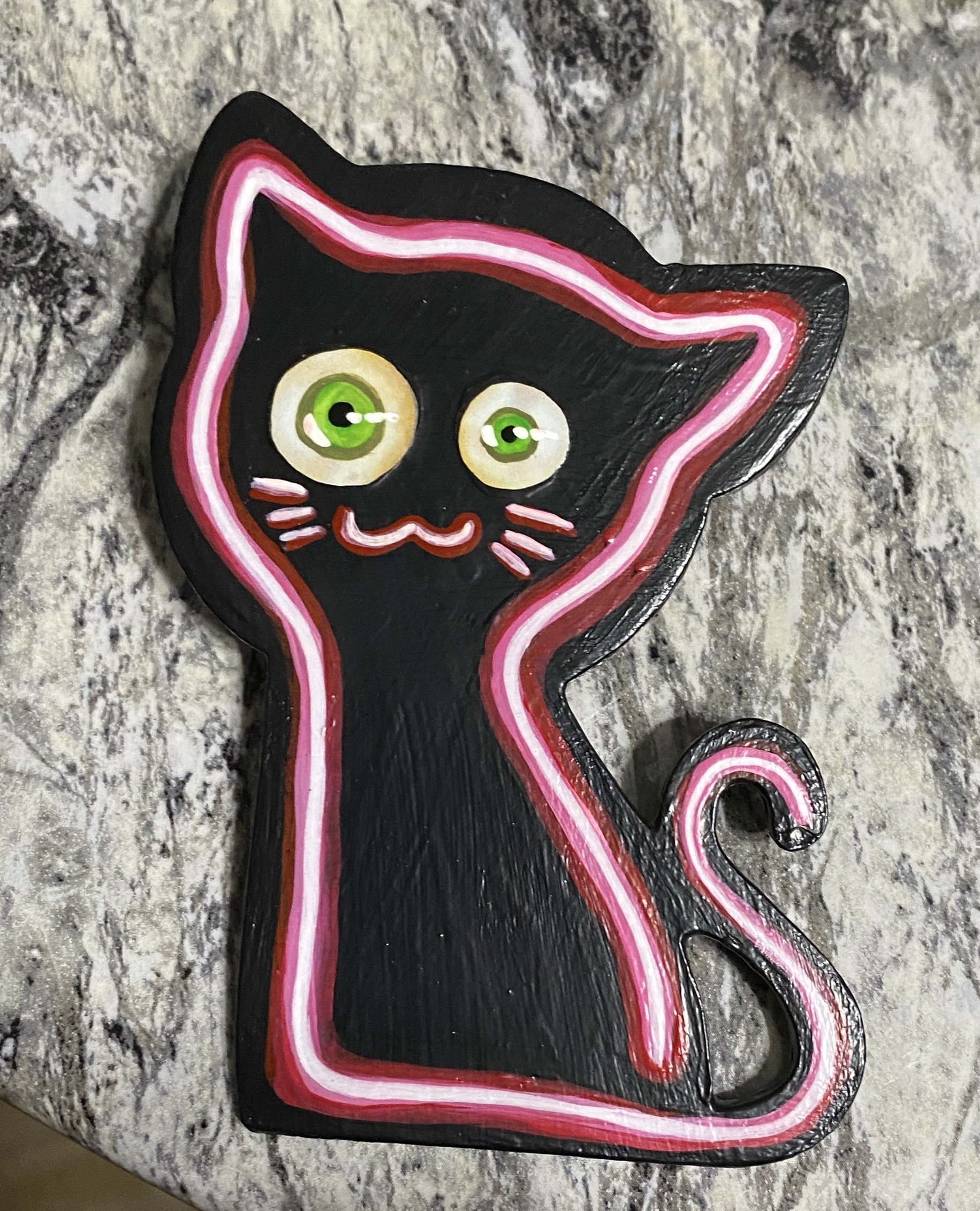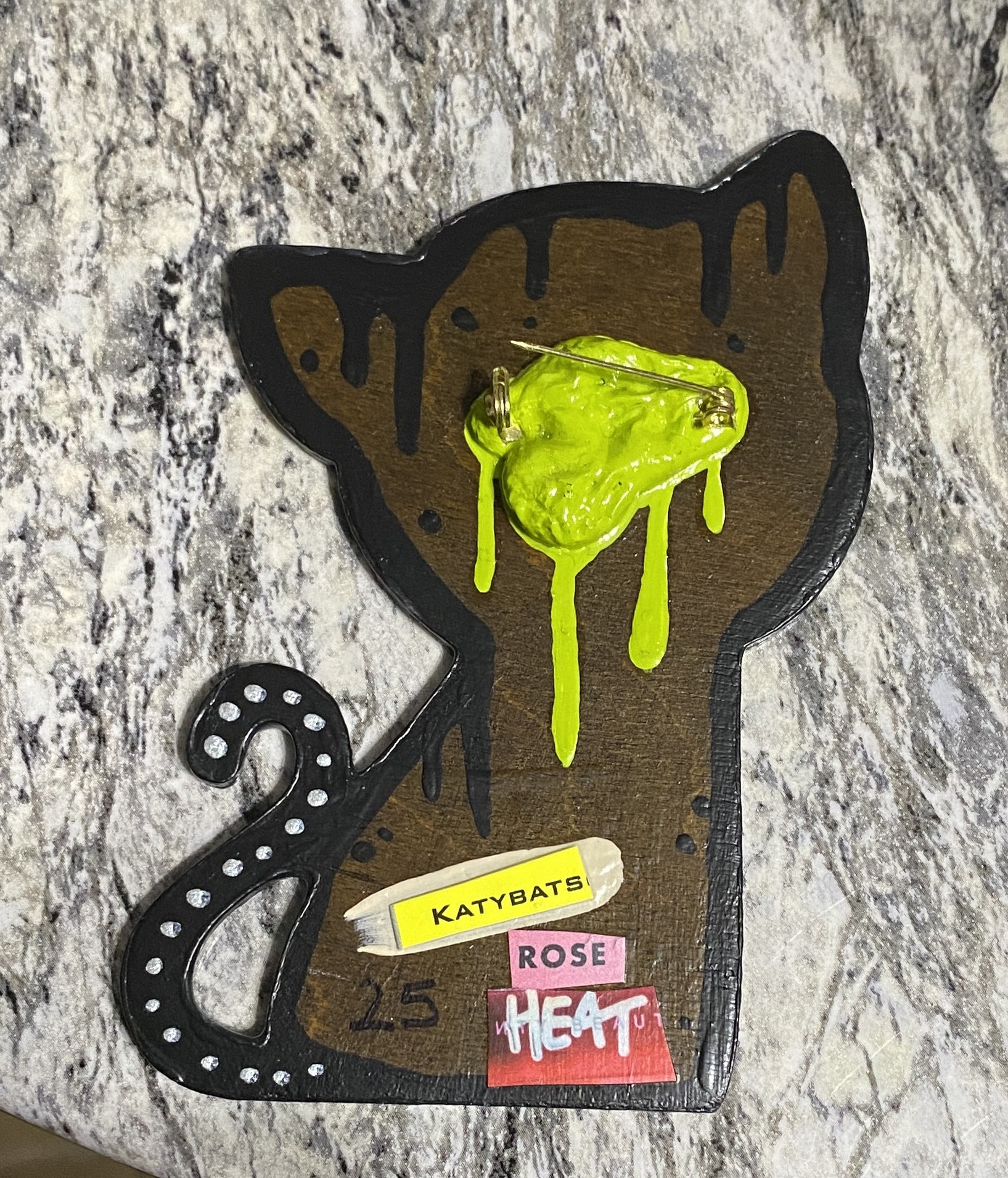 Rose Heat. A simple neon friend. Hand-painted. about 3 by 4 inches. wooden pinback kitty.