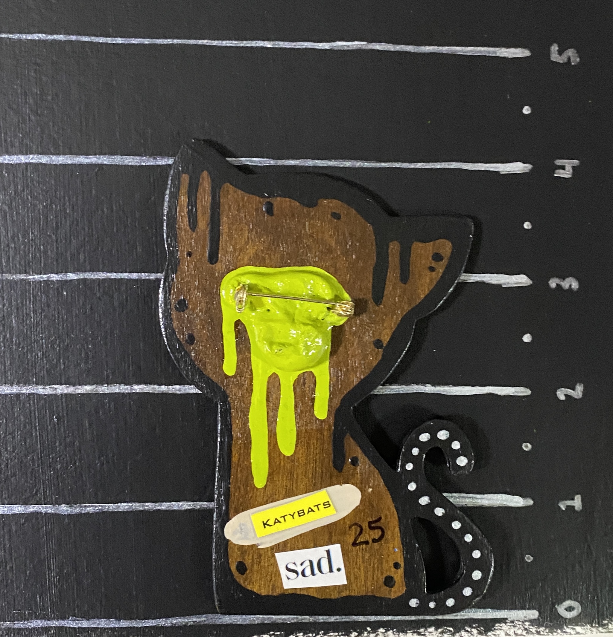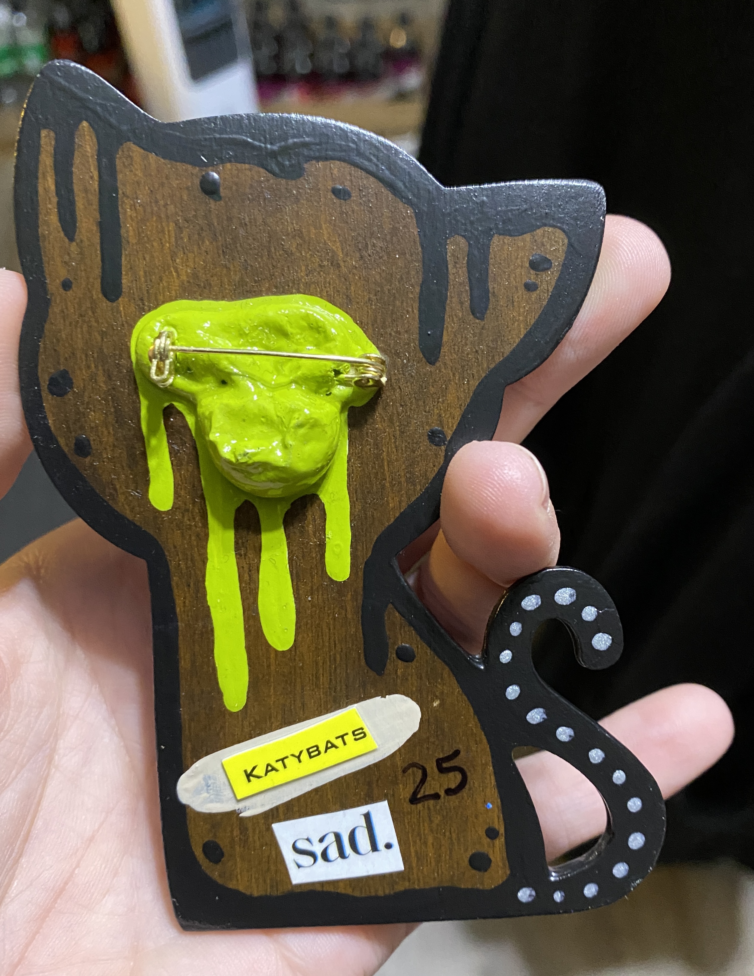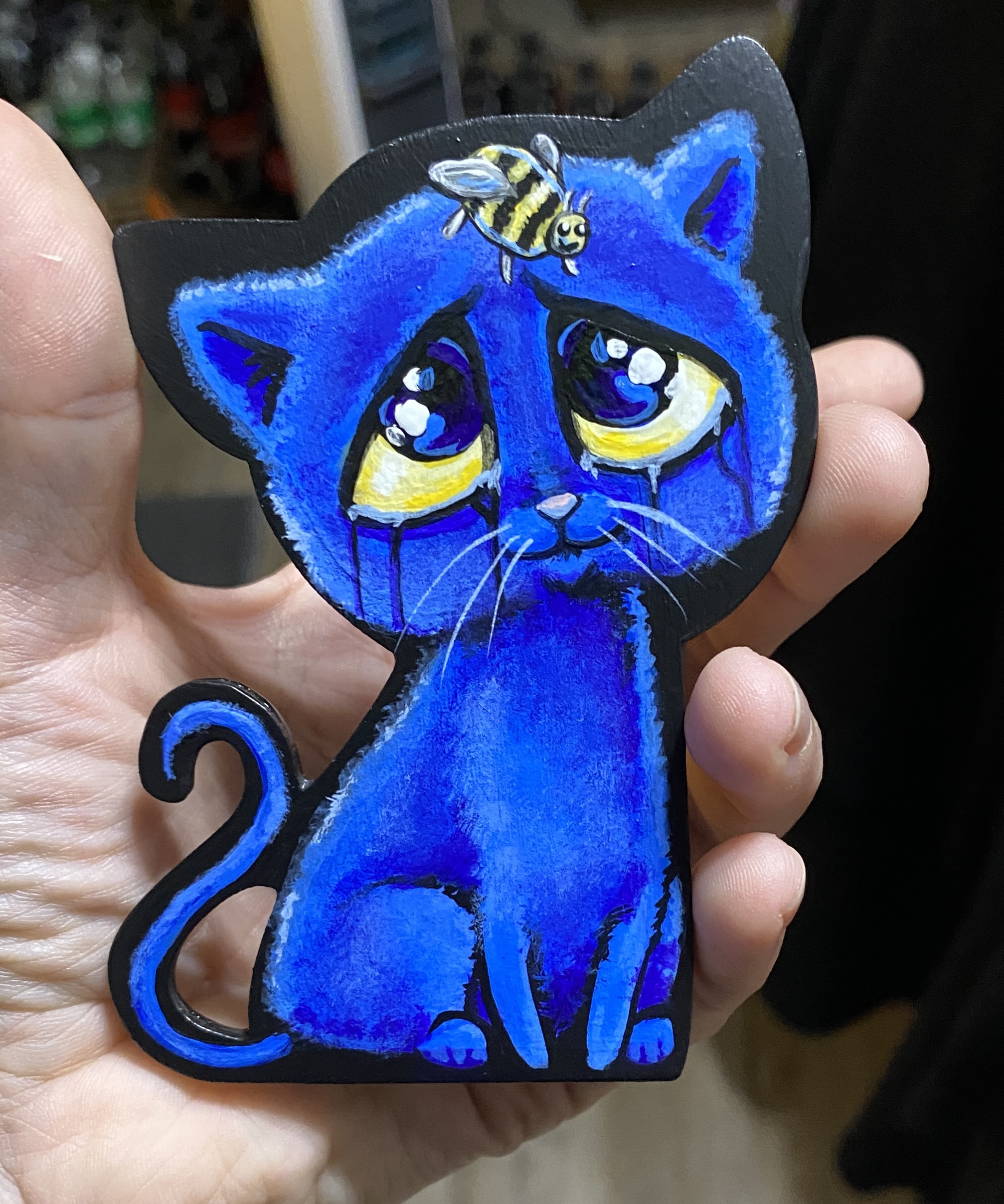 Sad. But not for long, since his bee friend arrived to cheer him up. Hand-painted. about 3 by 4 inches. wooden pinback kitty.