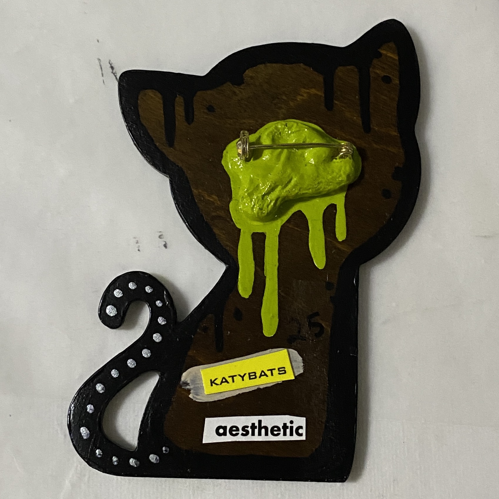 Baby Corn doesn’t know if it’s Taco Tuesday or Tongue Out Tuesday. Why not both? Hand-painted. about 3 by 4 inches. wooden pinback kitty.